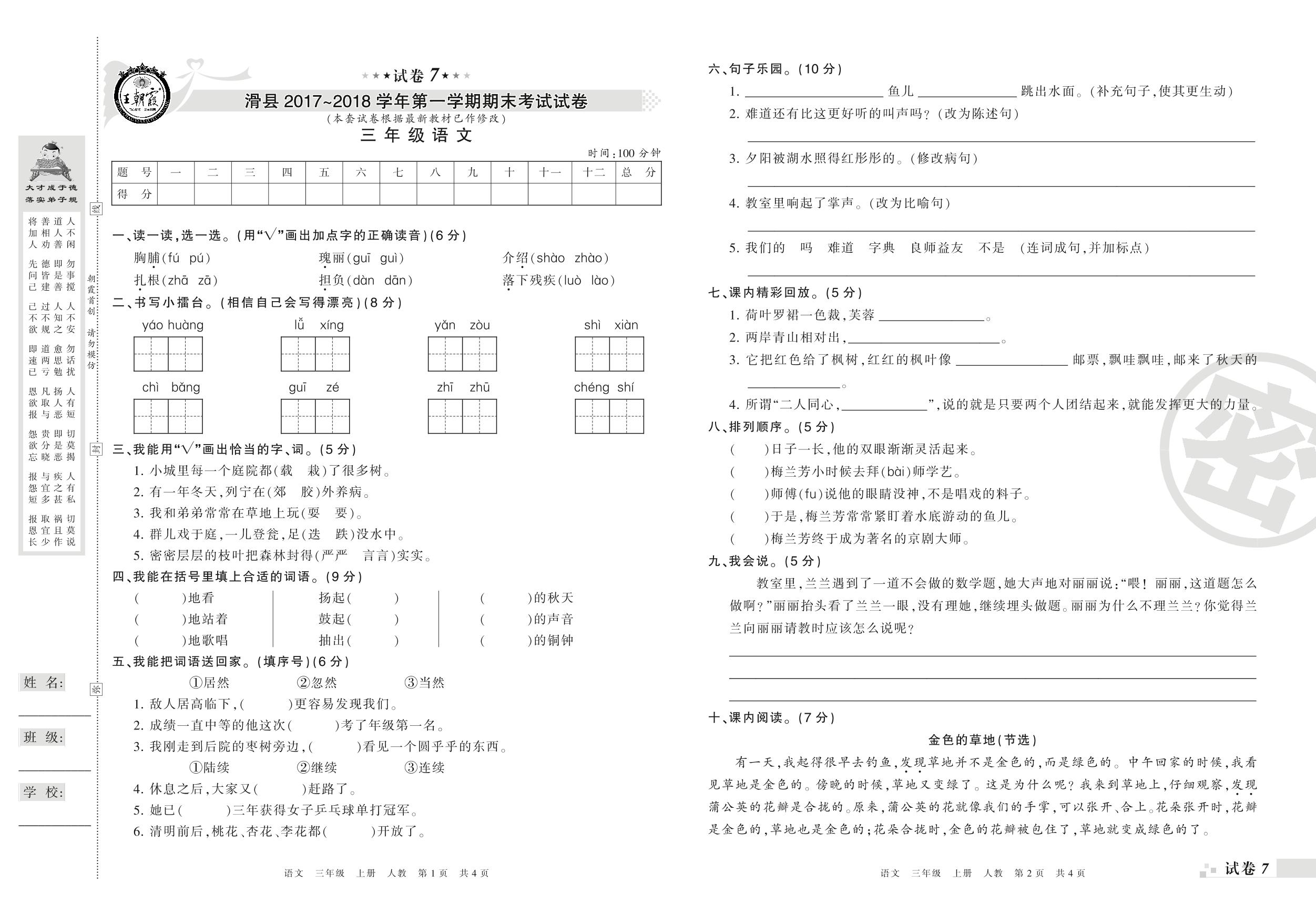 2017-2018学年第一学期安阳市滑县三年级语文试卷(人教版)【7】