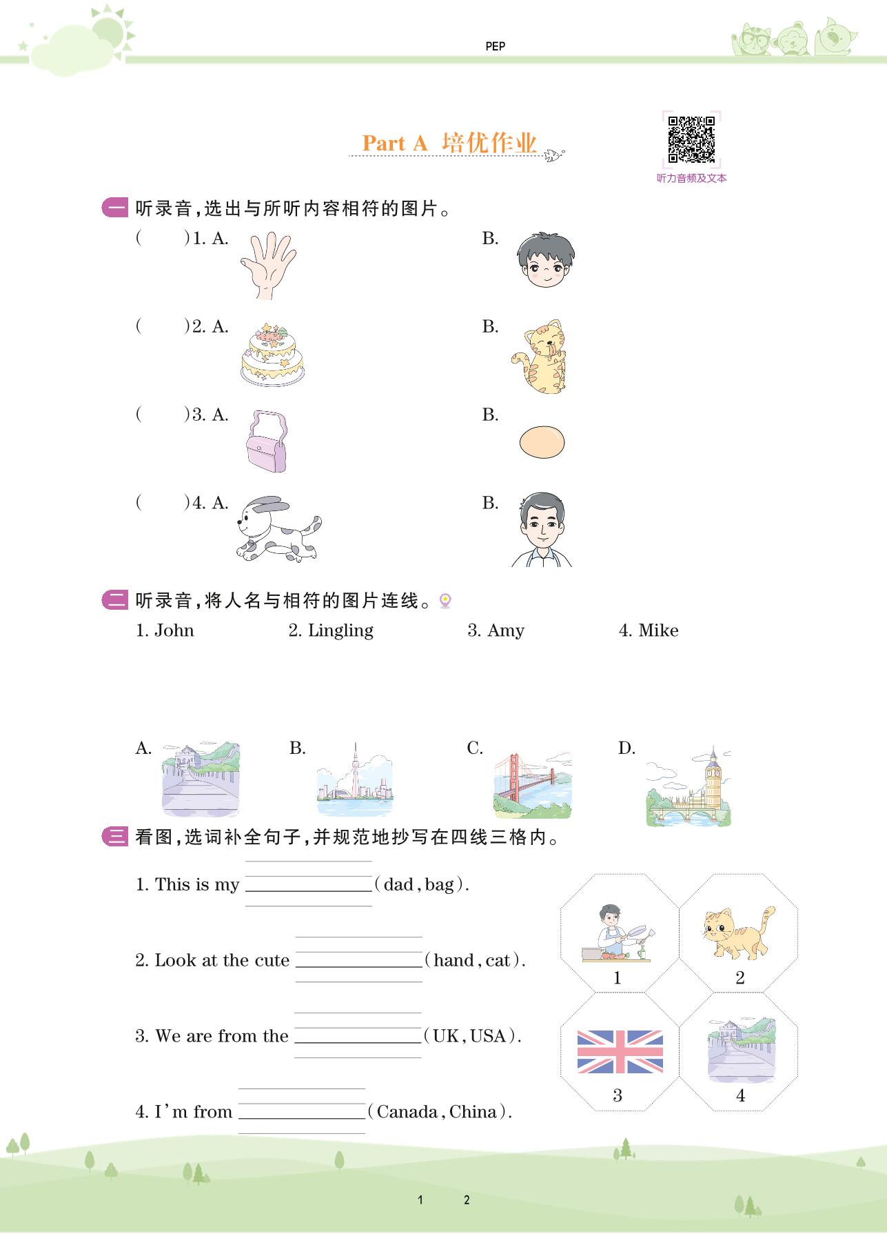 2021下册三年级英语PEP版 Unit 1 Part A 培优作业