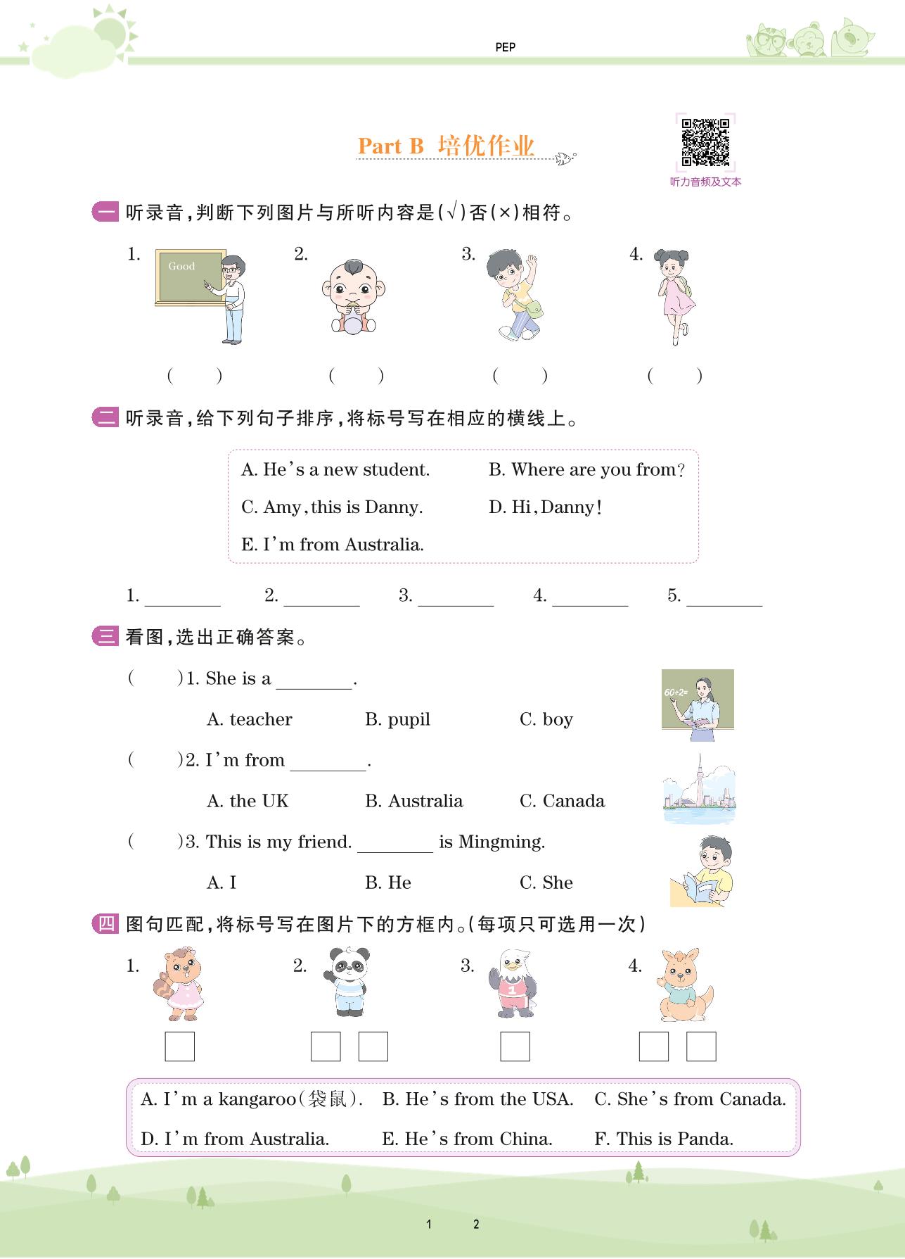 2021下册三年级英语PEP版 Unit 1 Part B 培优作业