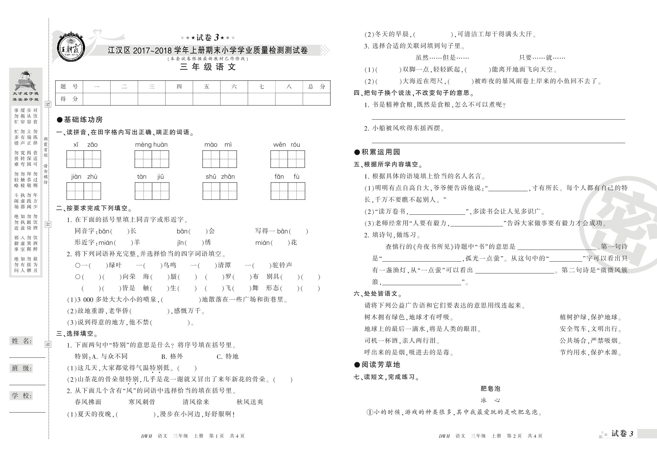 2017-2018学年第一学期武汉市江汉区三年级语文试卷(鄂教版)【3】