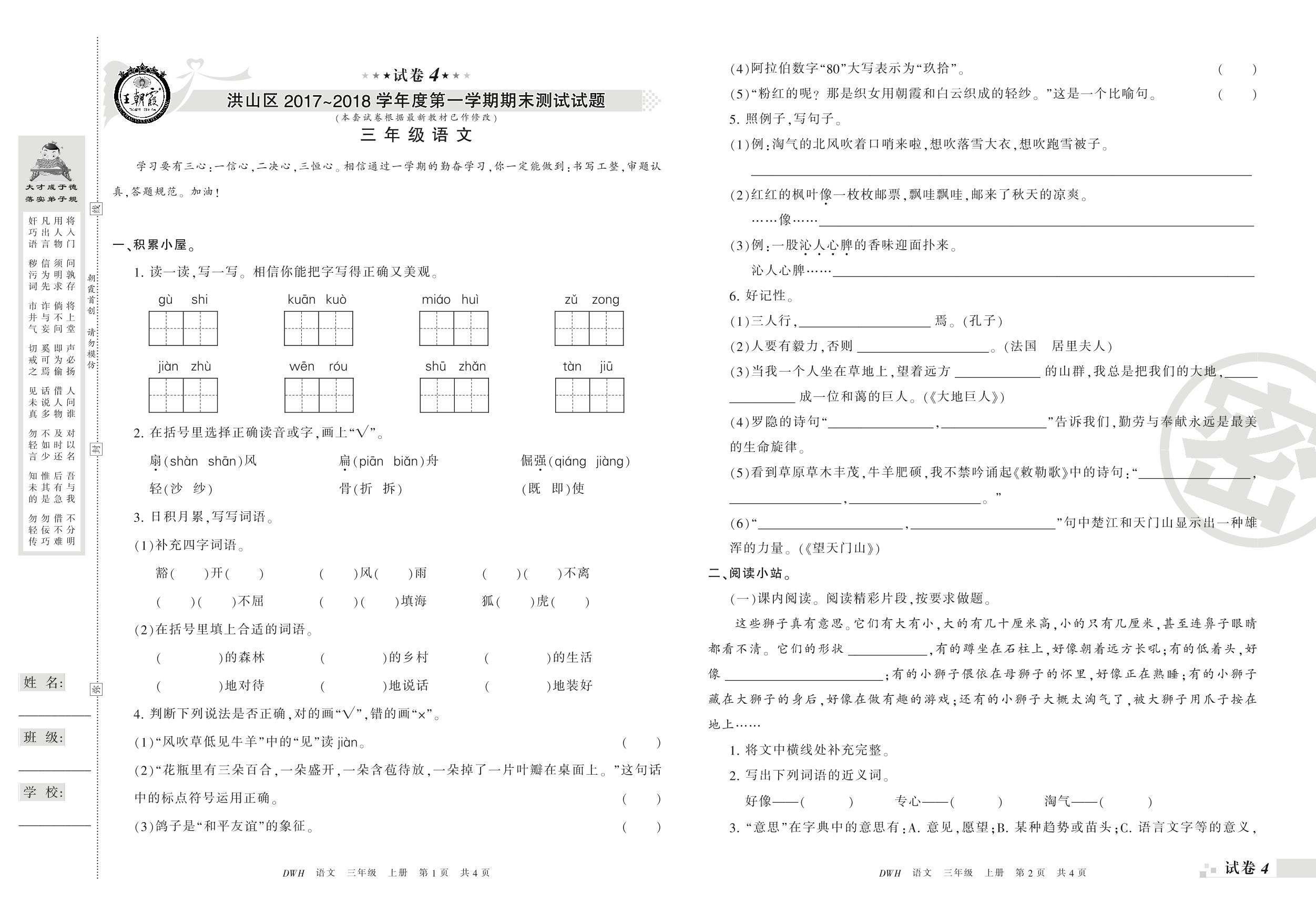2017-2018学年第一学期武汉市洪山区三年级语文试卷(鄂教版)【4】