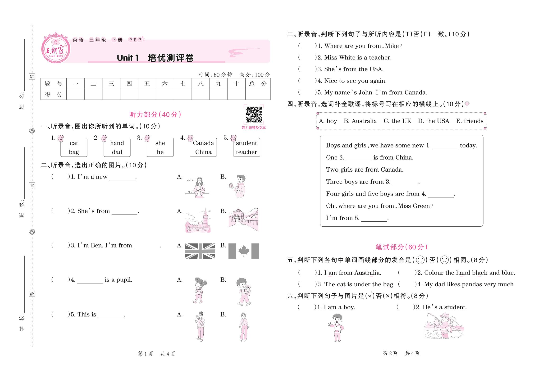 2021下册三年级英语PEP版 Unit 1 培优测评卷
