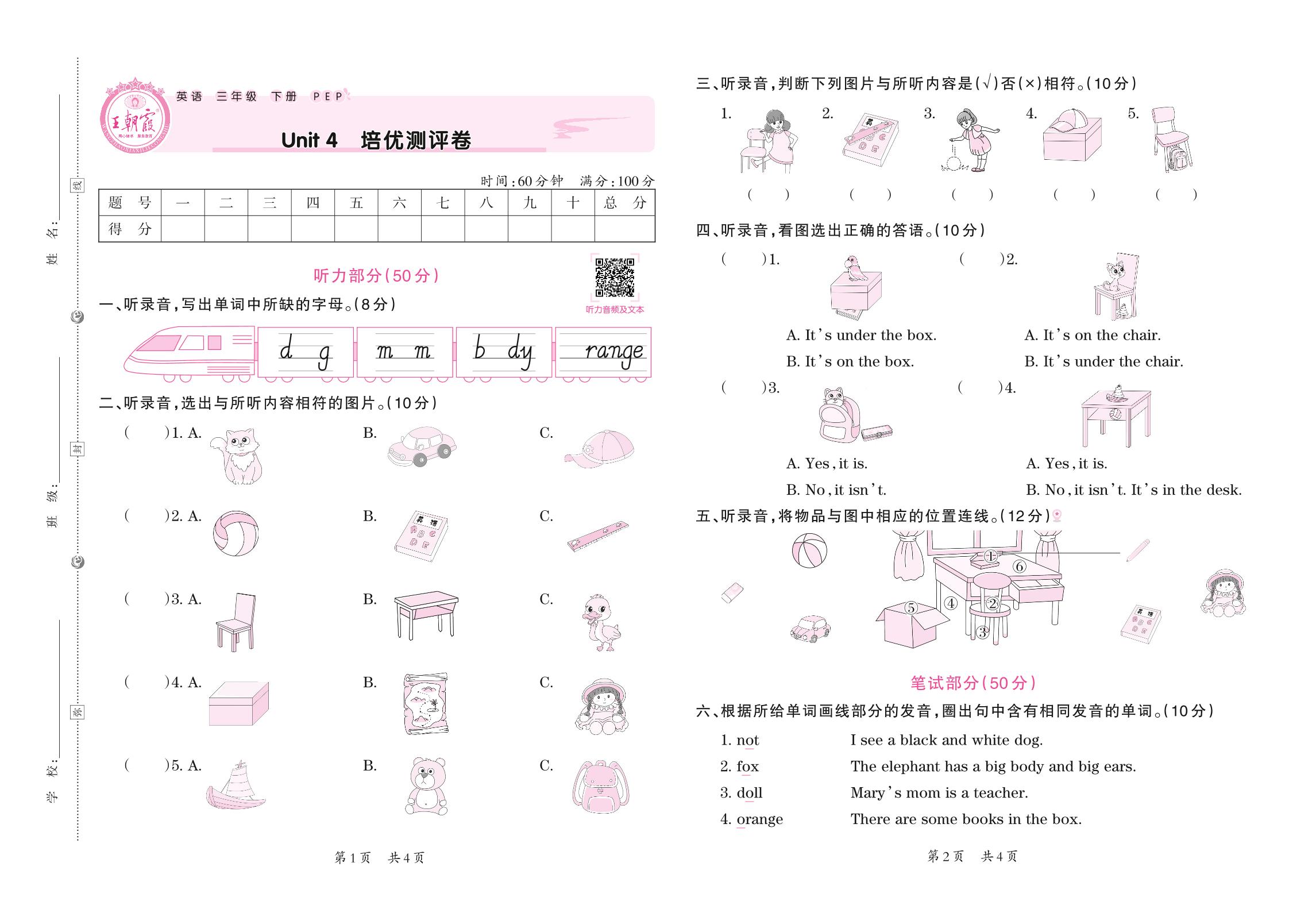 2021下册三年级英语PEP版 Unit 4 培优测评卷