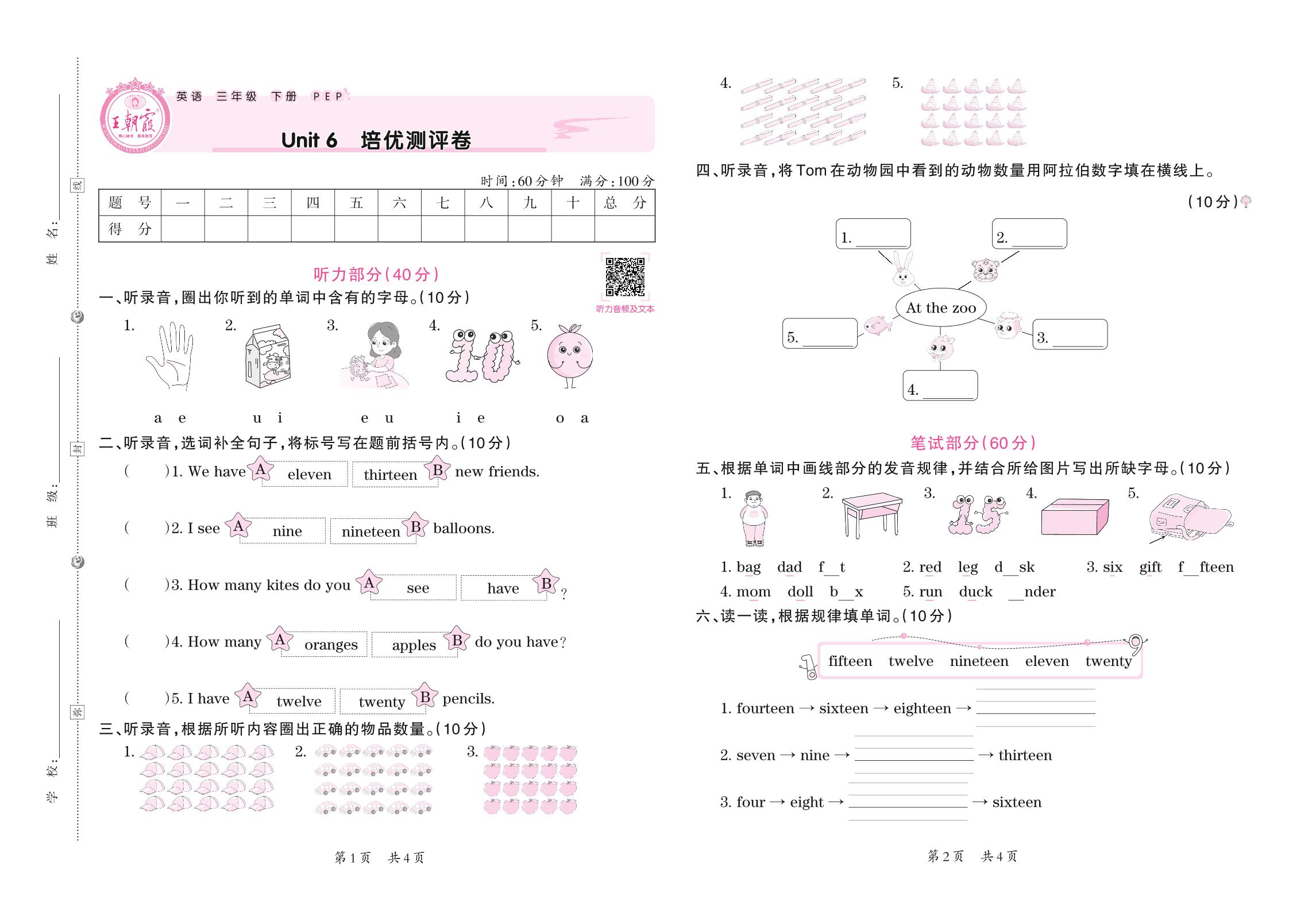 三年级英语人教PEP版(三起始)下册单元卷