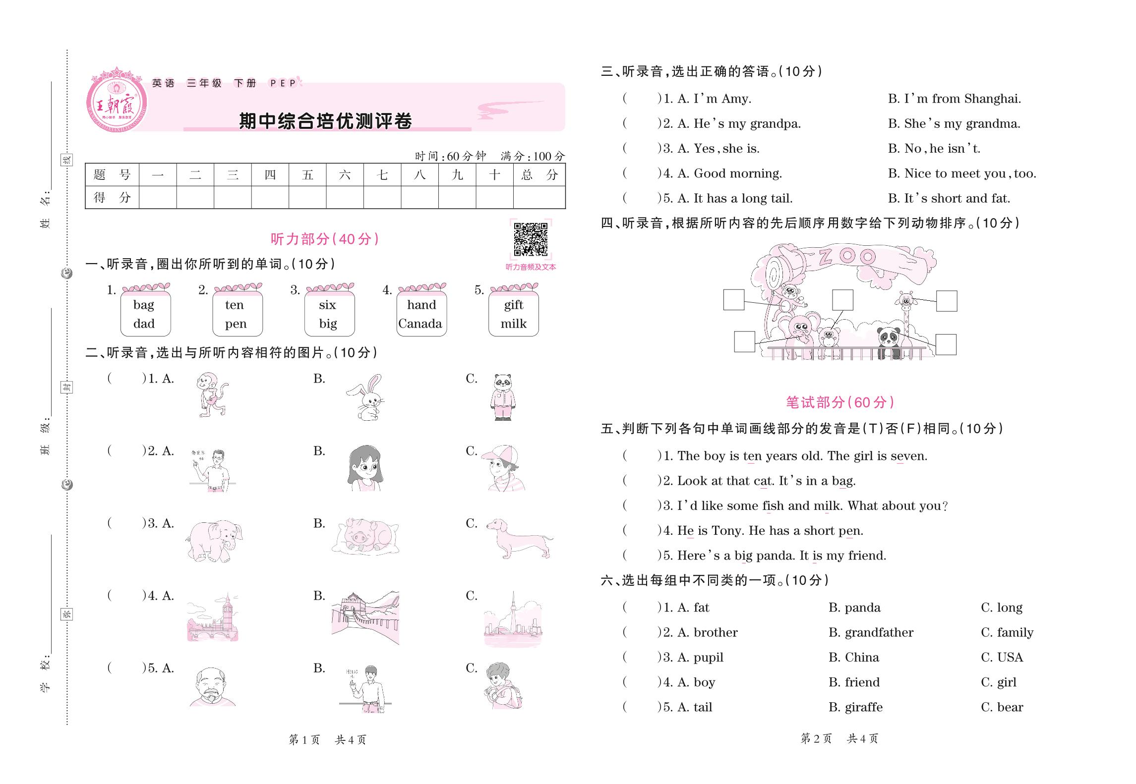 2021下册三年级英语PEP版 期中综合培优测评卷