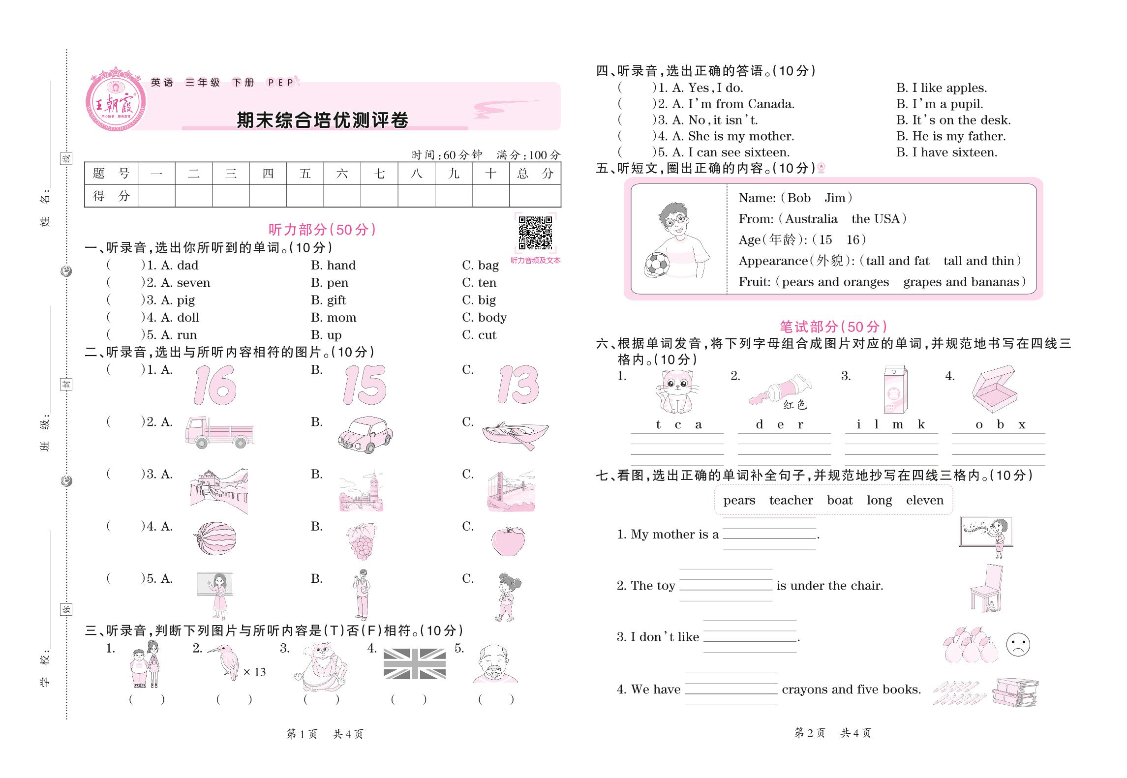 2021下册三年级英语PEP版 期末综合培优测评卷