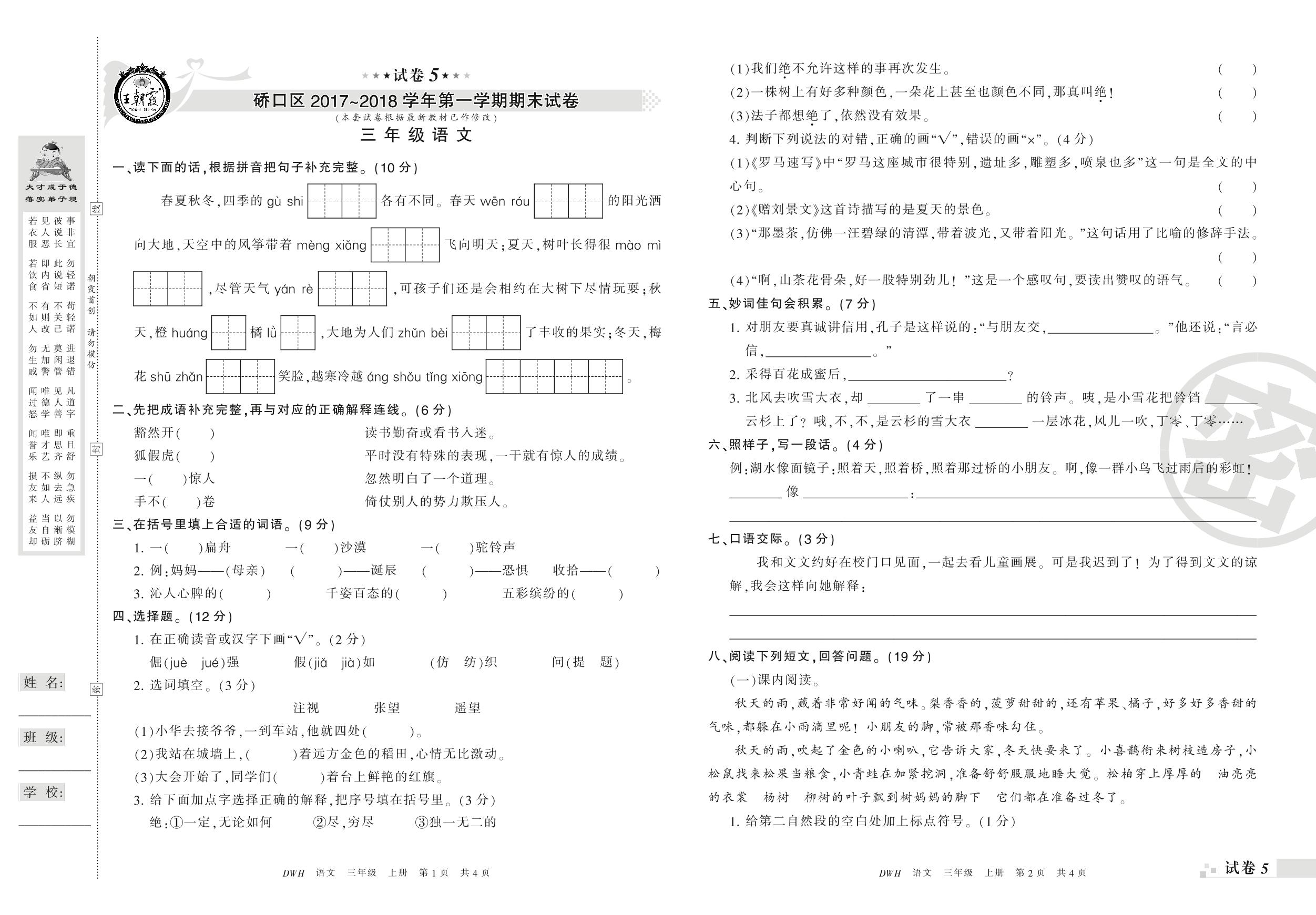 2017-2018学年第一学期武汉市硚口区三年级语文试卷(鄂教版)【5】
