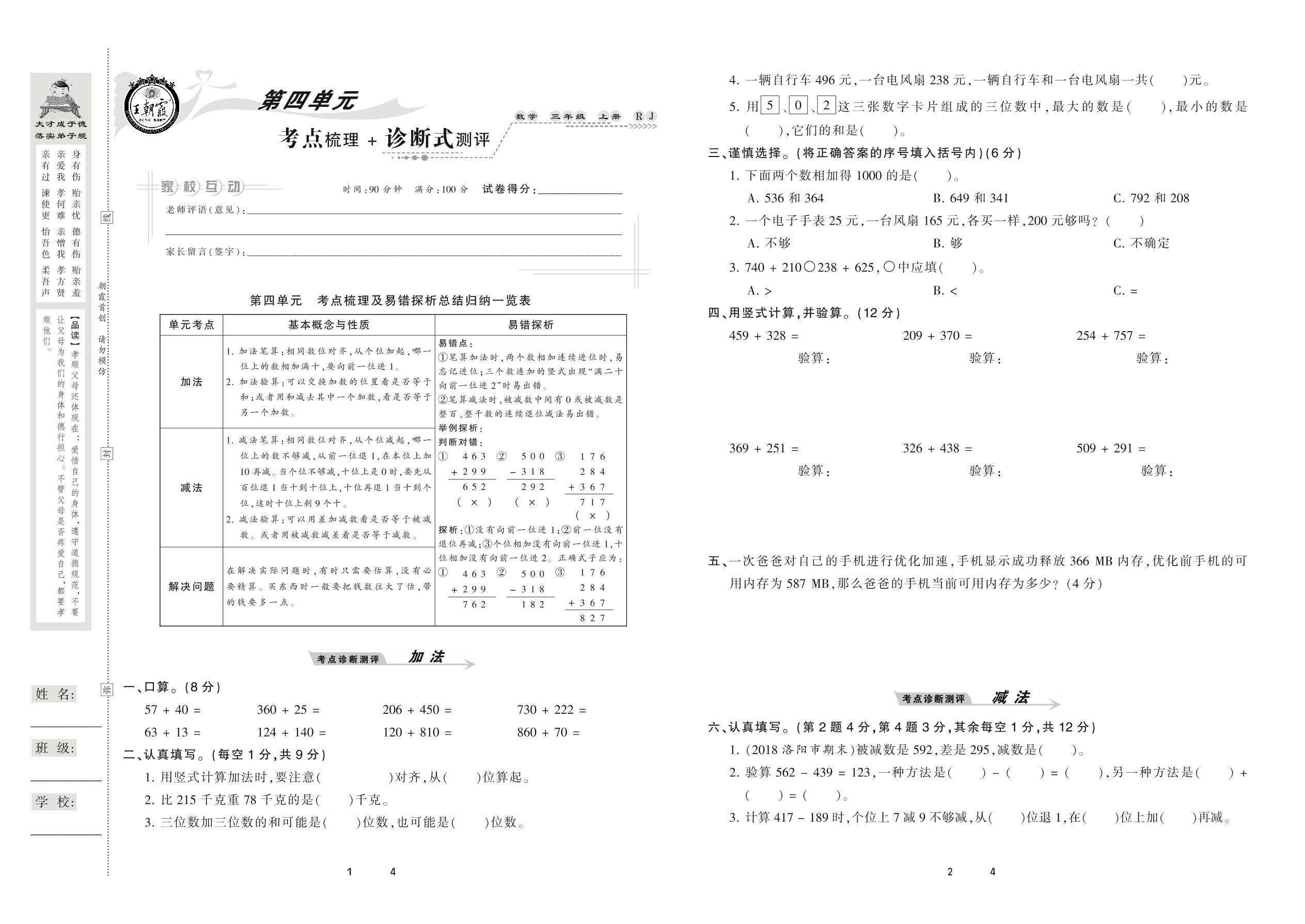 2020上册三年级数学人教版 第四单元 考点梳理 + 诊断式测评