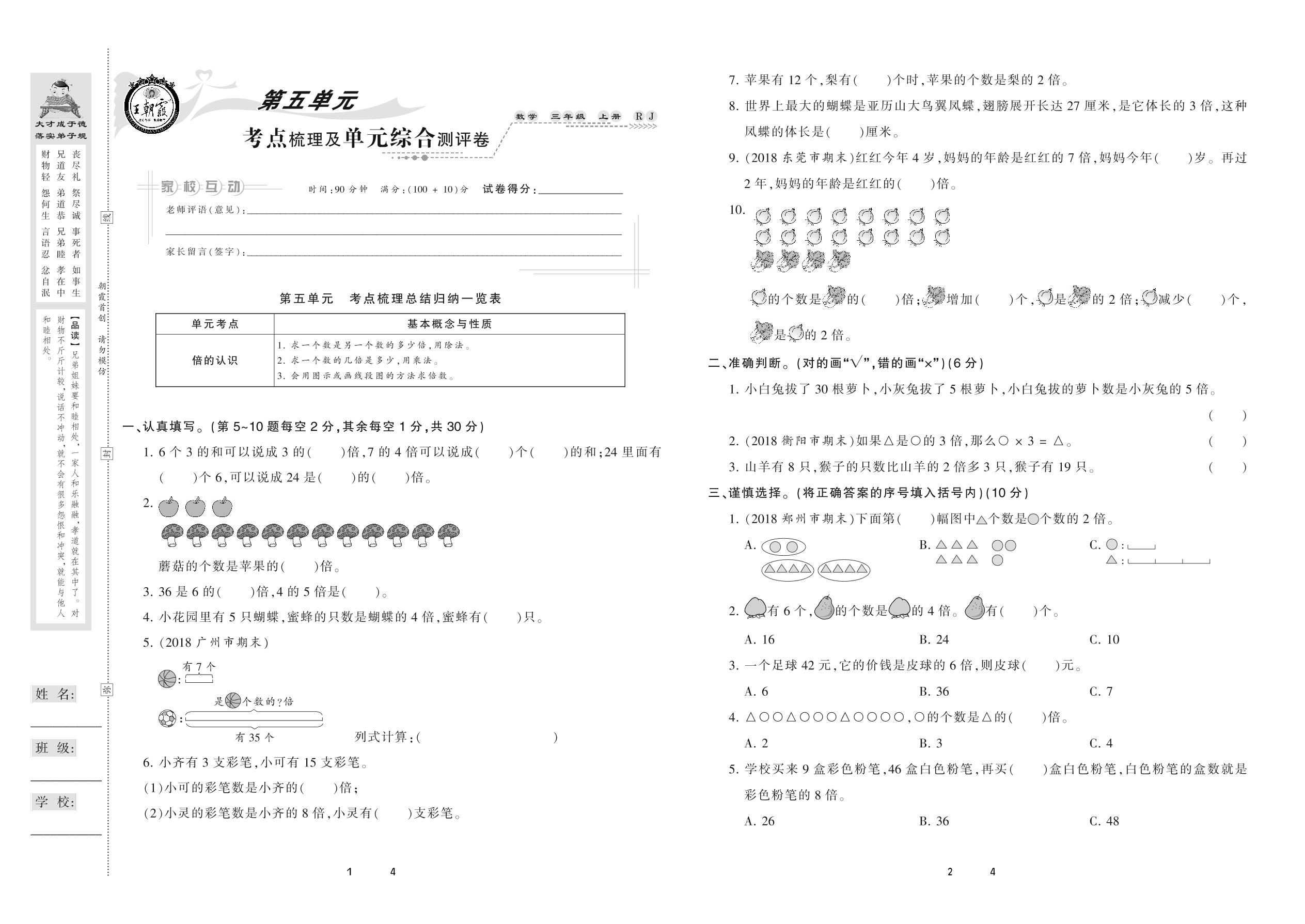 2020上册三年级数学人教版 第五单元 考点梳理及单元综合测评卷