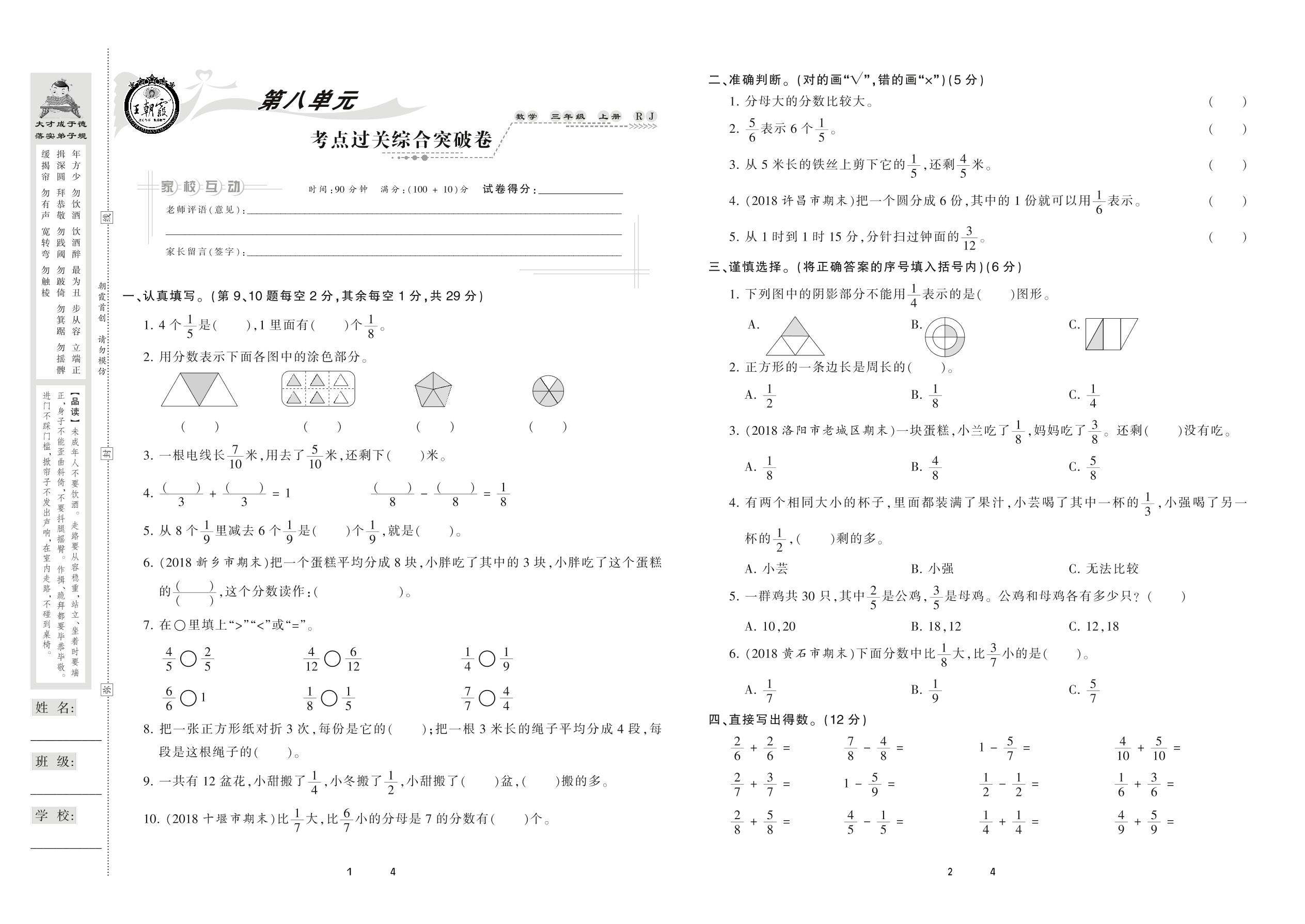 2020上册三年级数学人教版 第八单元 考点过关综合突破卷