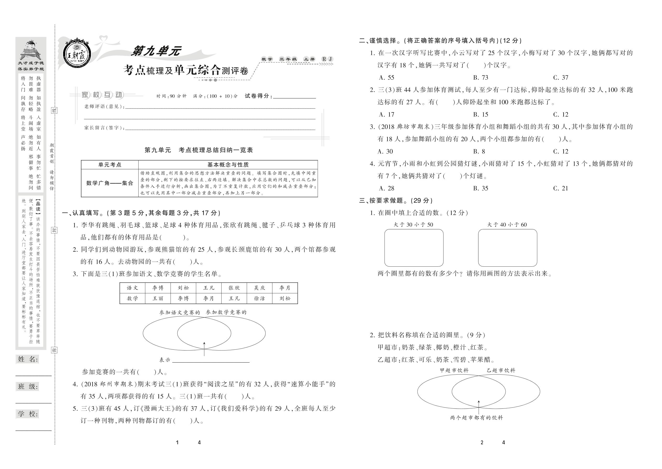 2020上册三年级数学人教版 第九单元 考点梳理及单元综合测评卷