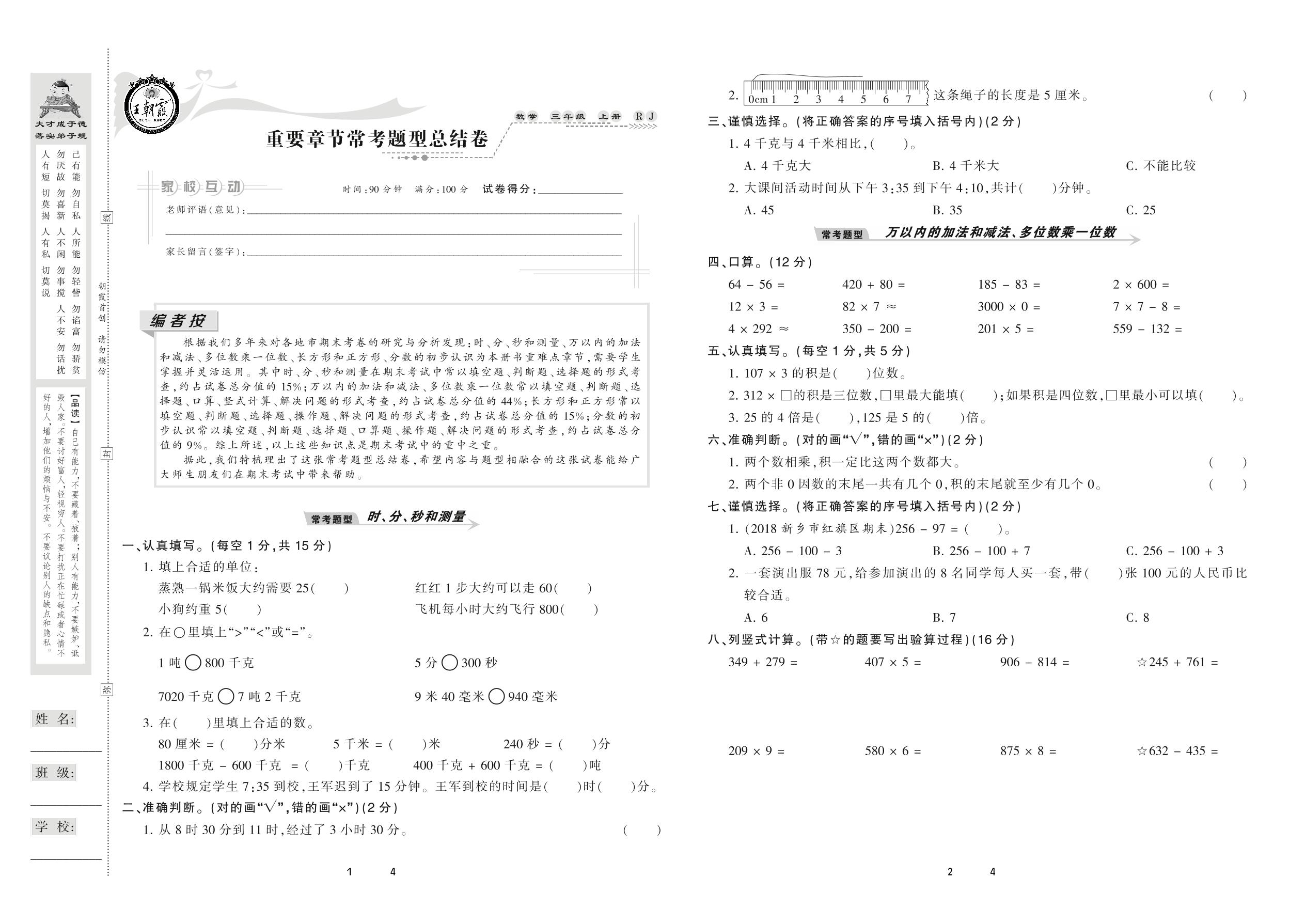 2020上册三年级数学人教版 重要章节常考题型总结卷