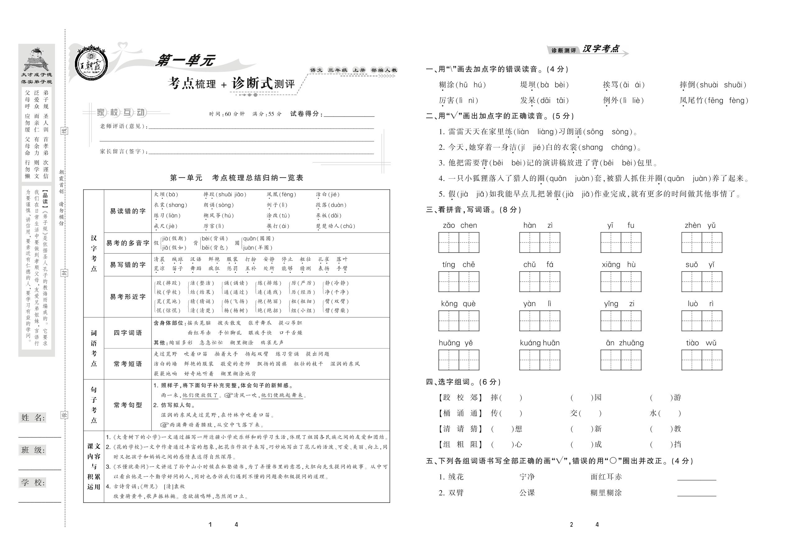 2020上册三年级语文人教版 第一单元 考点梳理+诊断式测评