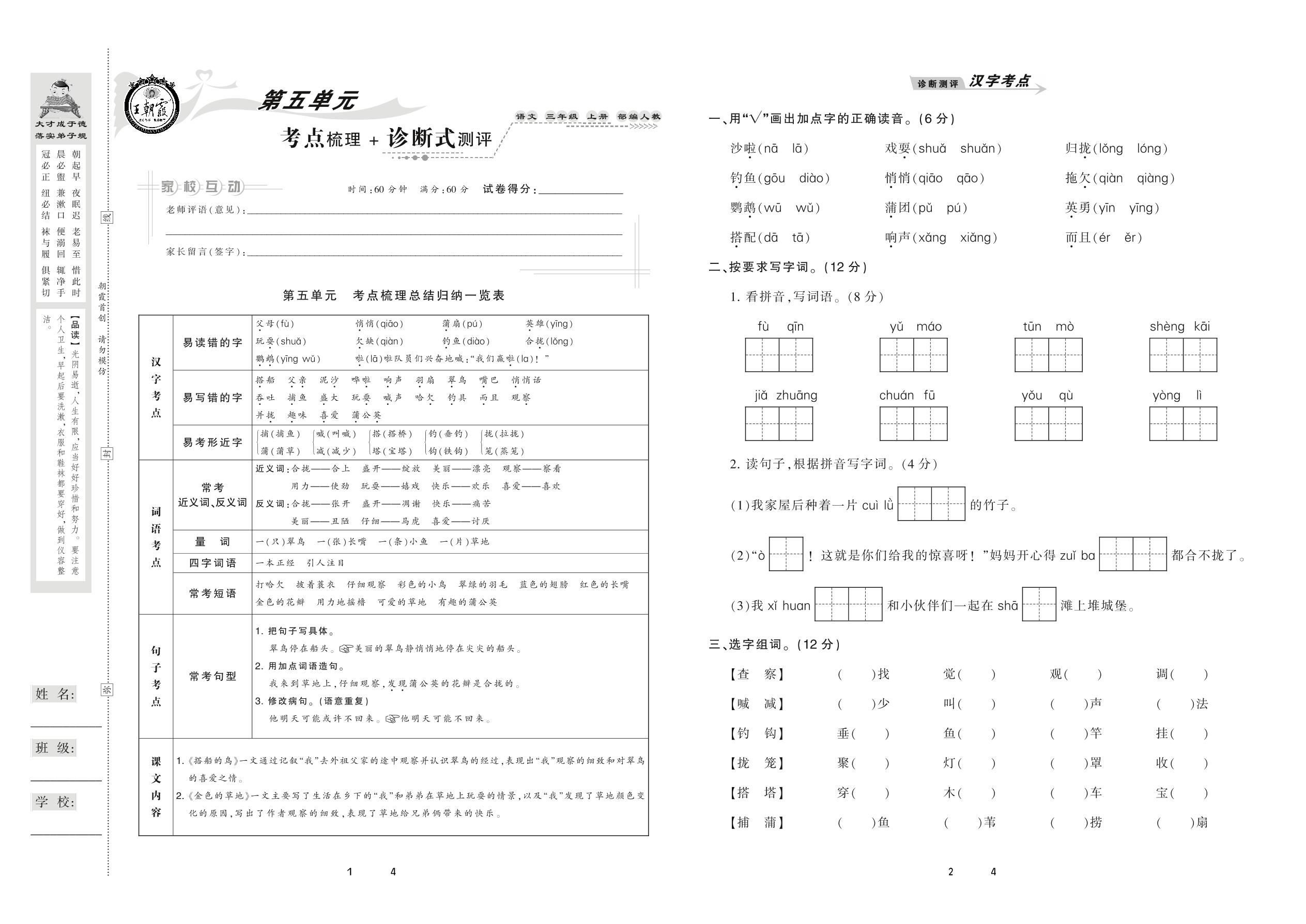 2020上册三年级语文人教版 第五单元 考点梳理+诊断式测评