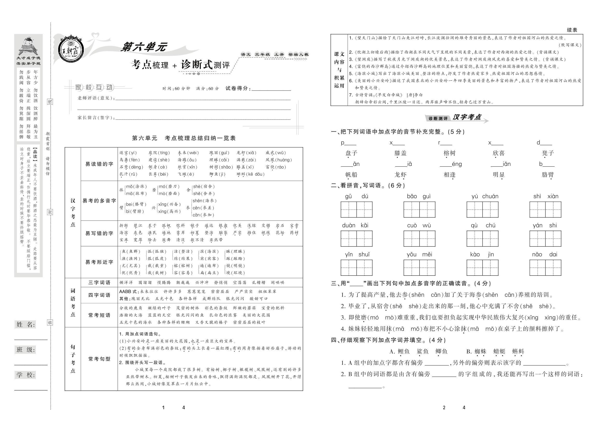 2020上册三年级语文人教版 第六单元 考点梳理+诊断式测评