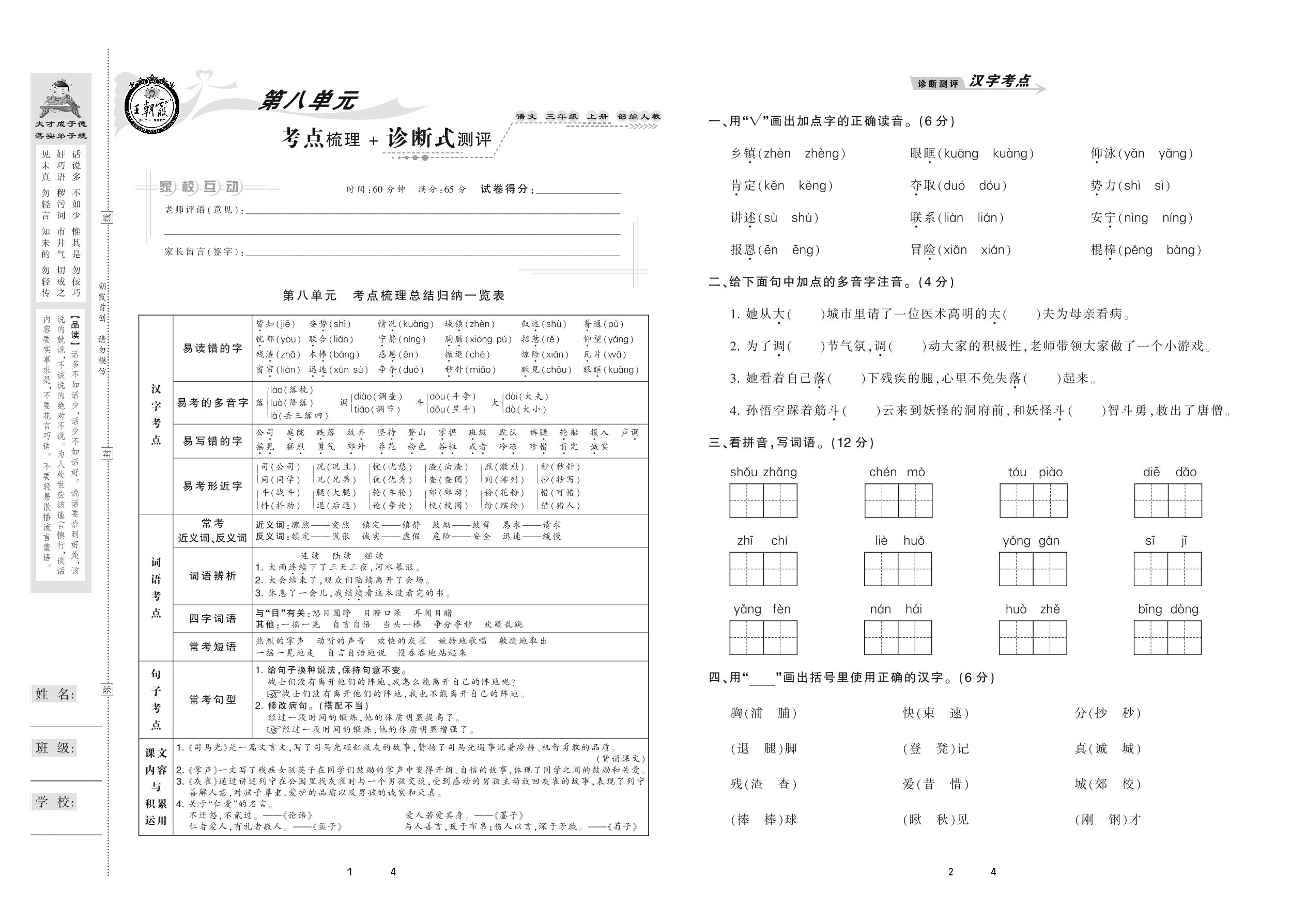 2020上册三年级语文人教版 第八单元 考点梳理+诊断式测评