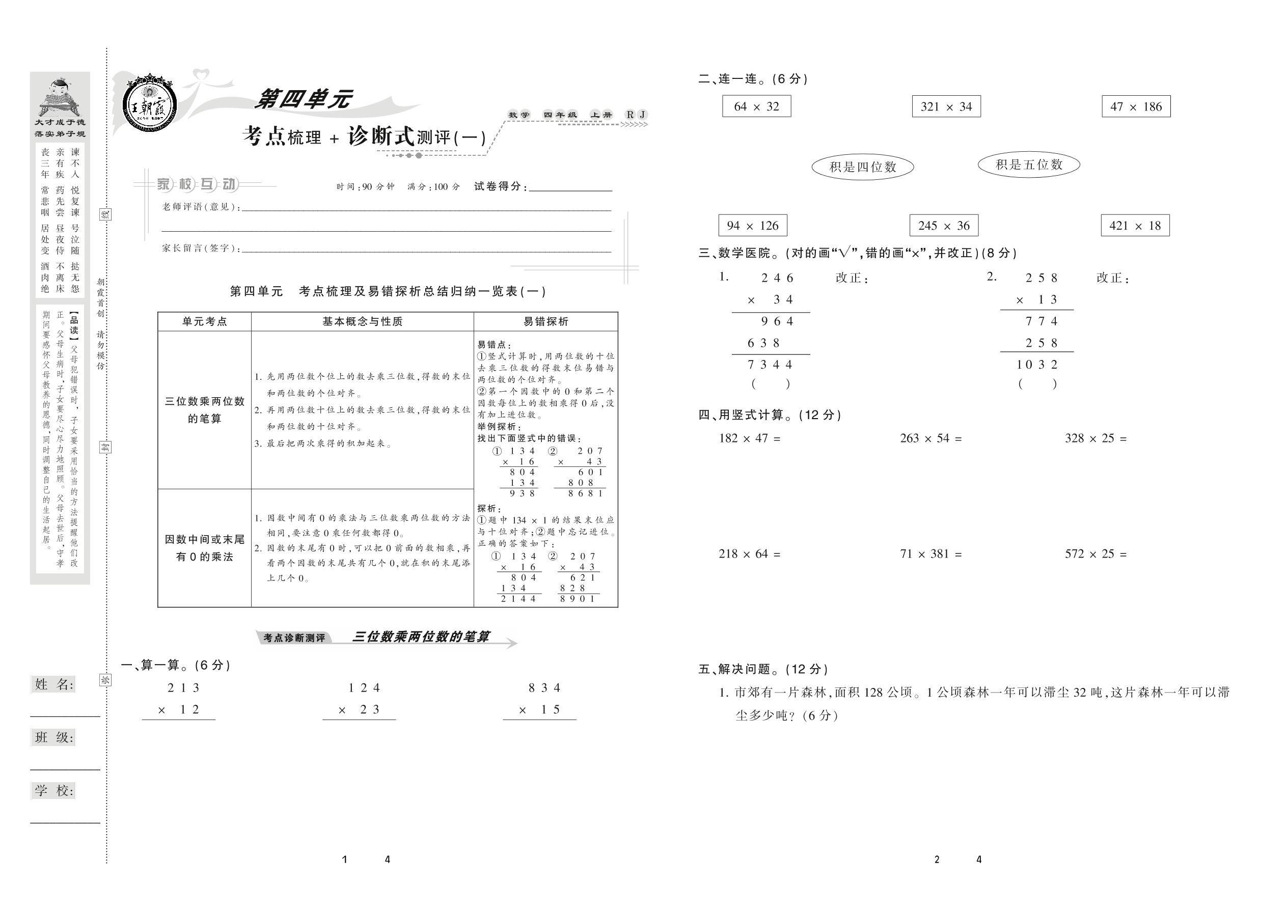 2020上册四年级数学人教版 第四单元 考点梳理+诊断式测评(一)