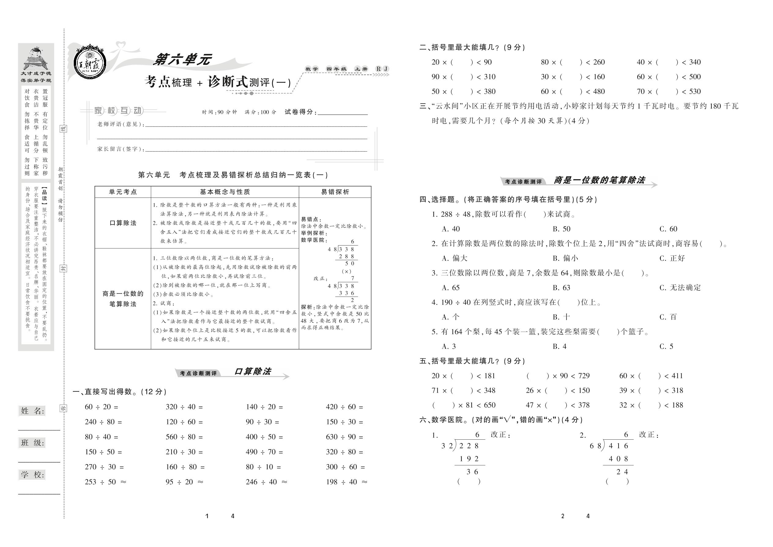 2020上册四年级数学人教版 第六单元 考点梳理+诊断式测评(一)