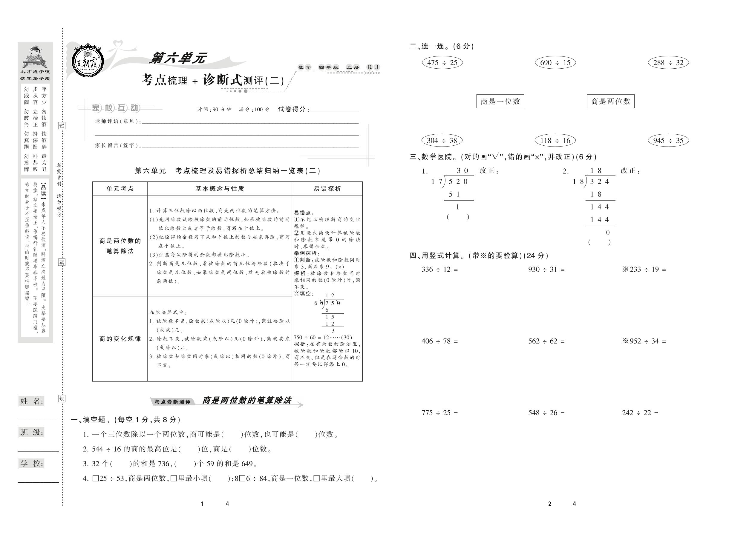 2020上册四年级数学人教版 第六单元 考点梳理+诊断式测评(二)