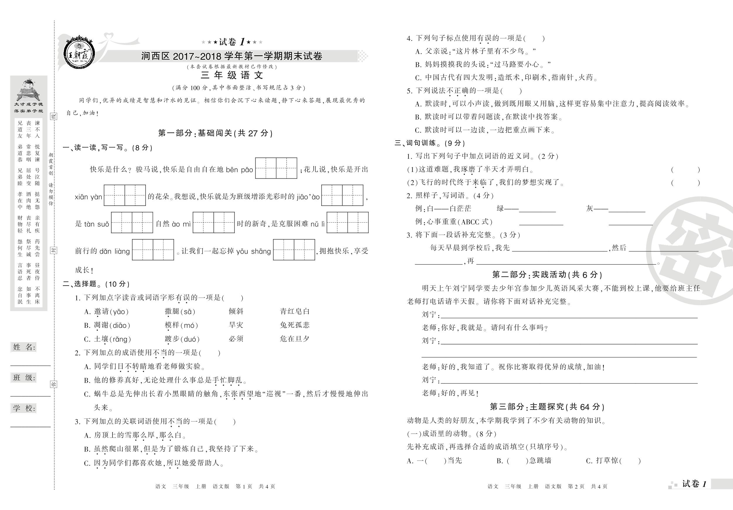 2017-2018学年第一学期洛阳市涧西区三年级语文试卷(语文版)_R210801103957【1】