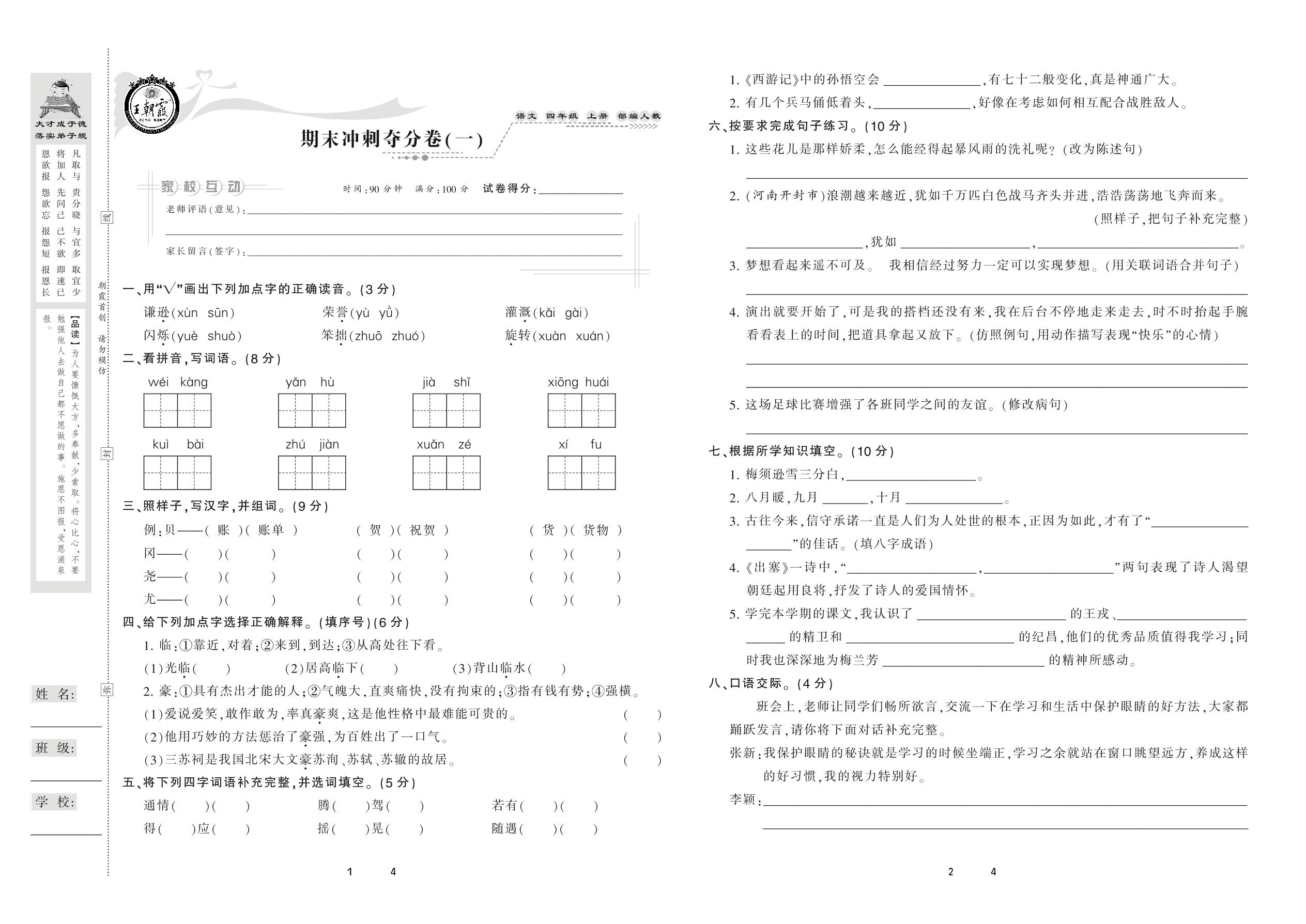 2020上册四年级语文人教版 期末冲刺夺分卷(一)