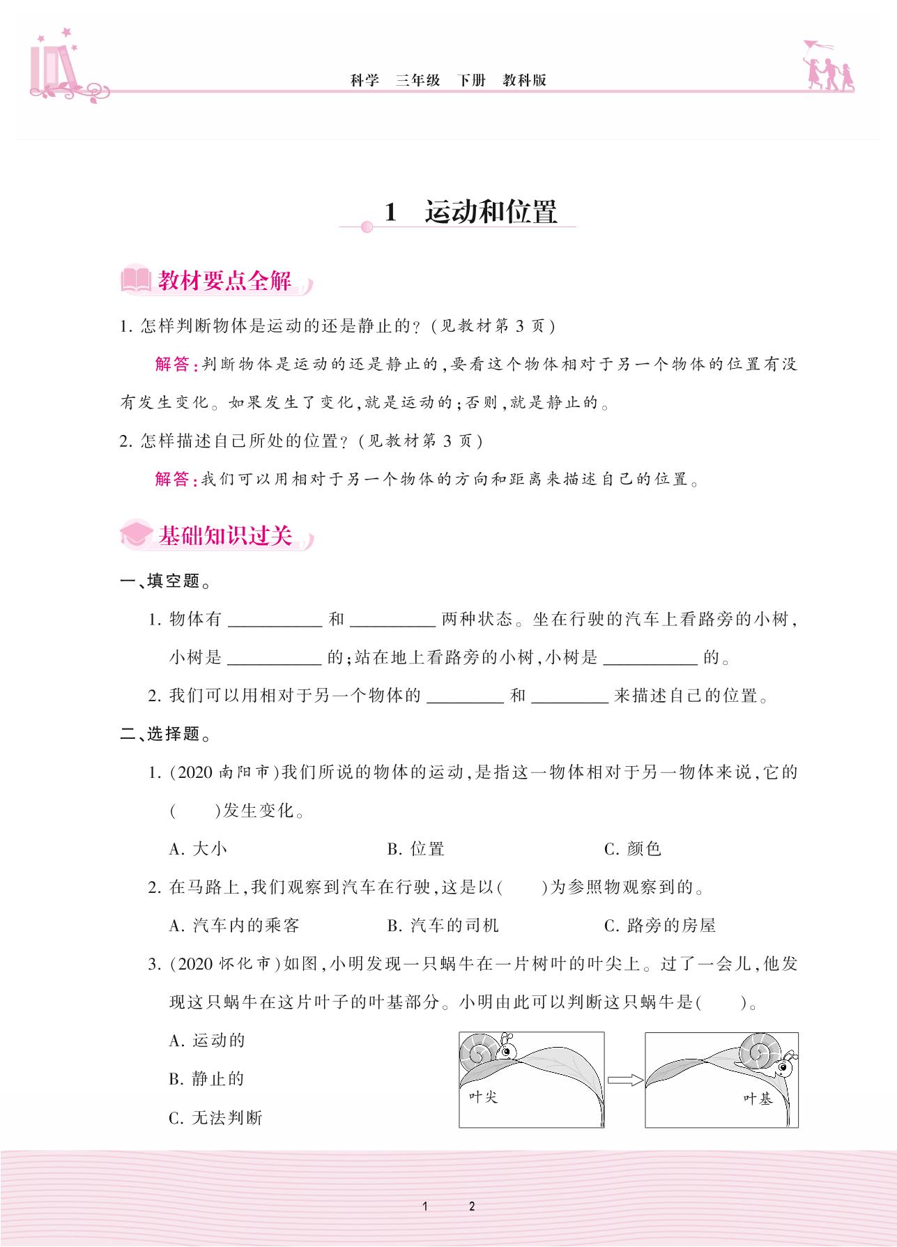 2021下册三年级科学教科版 第一单元 物体的运动——1 运动和位置