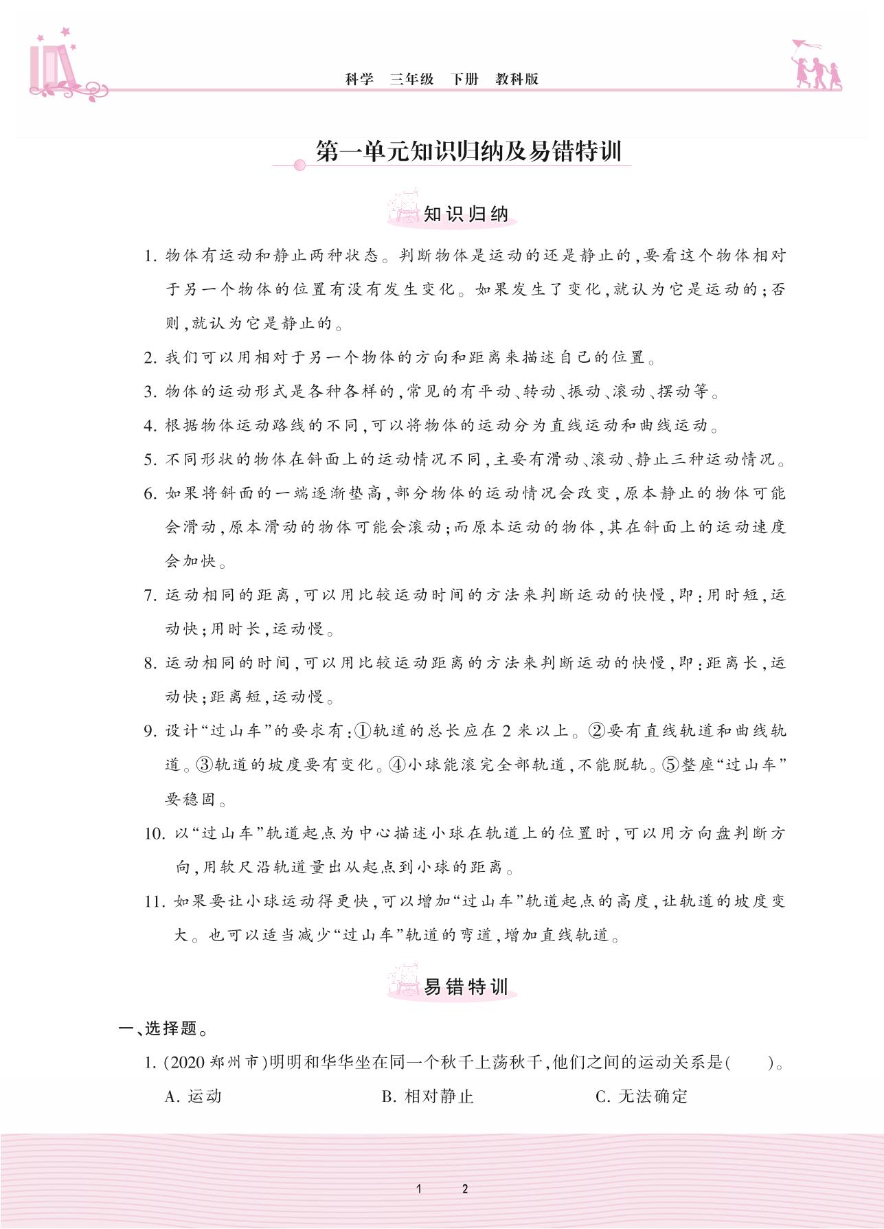 2021下册三年级科学教科版 第一单元 物体的运动——第一单元知识归纳及易错特训