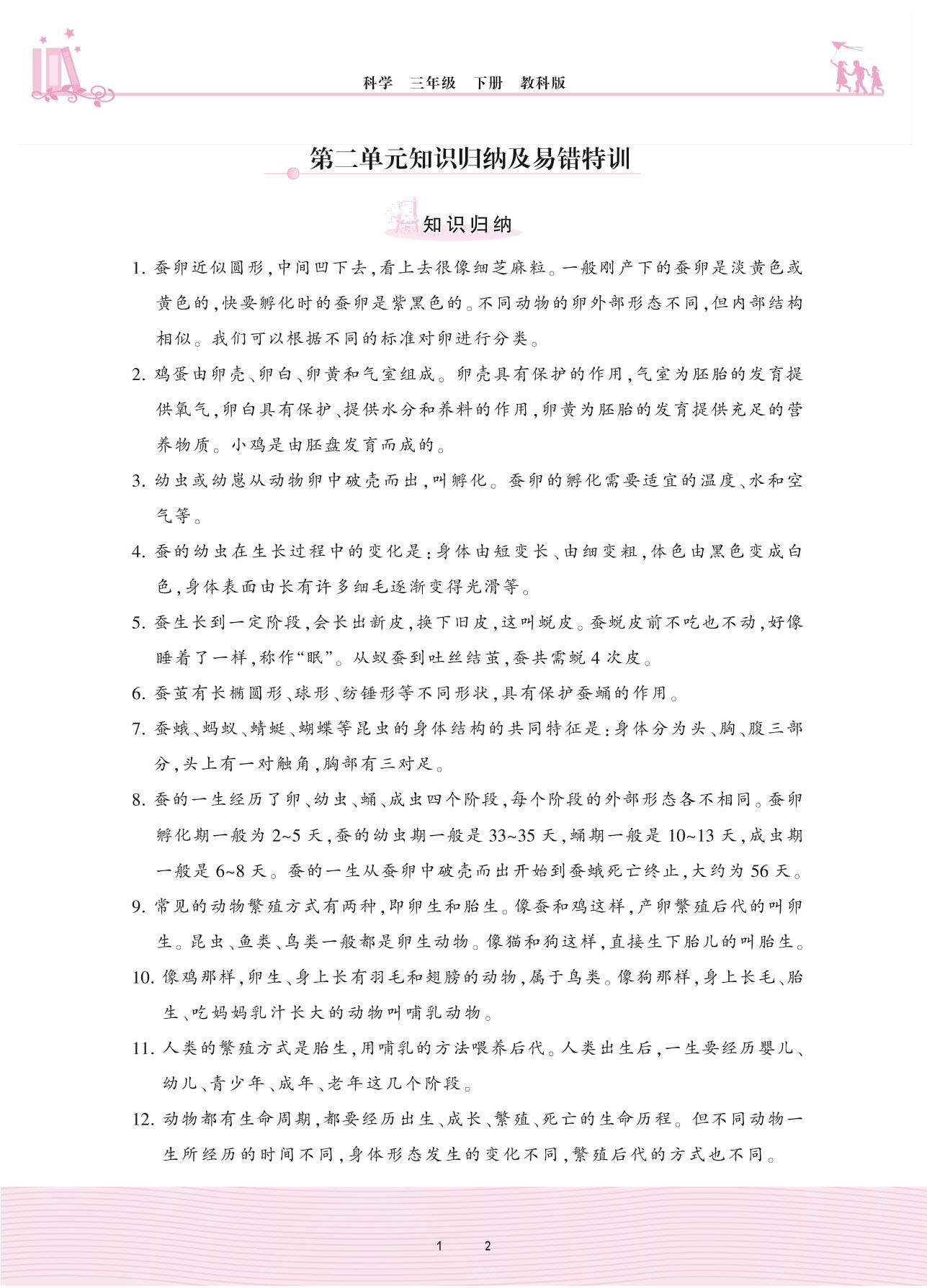 2021下册三年级科学教科版 第二单元 动物的一生——第二单元知识归纳及易错特训