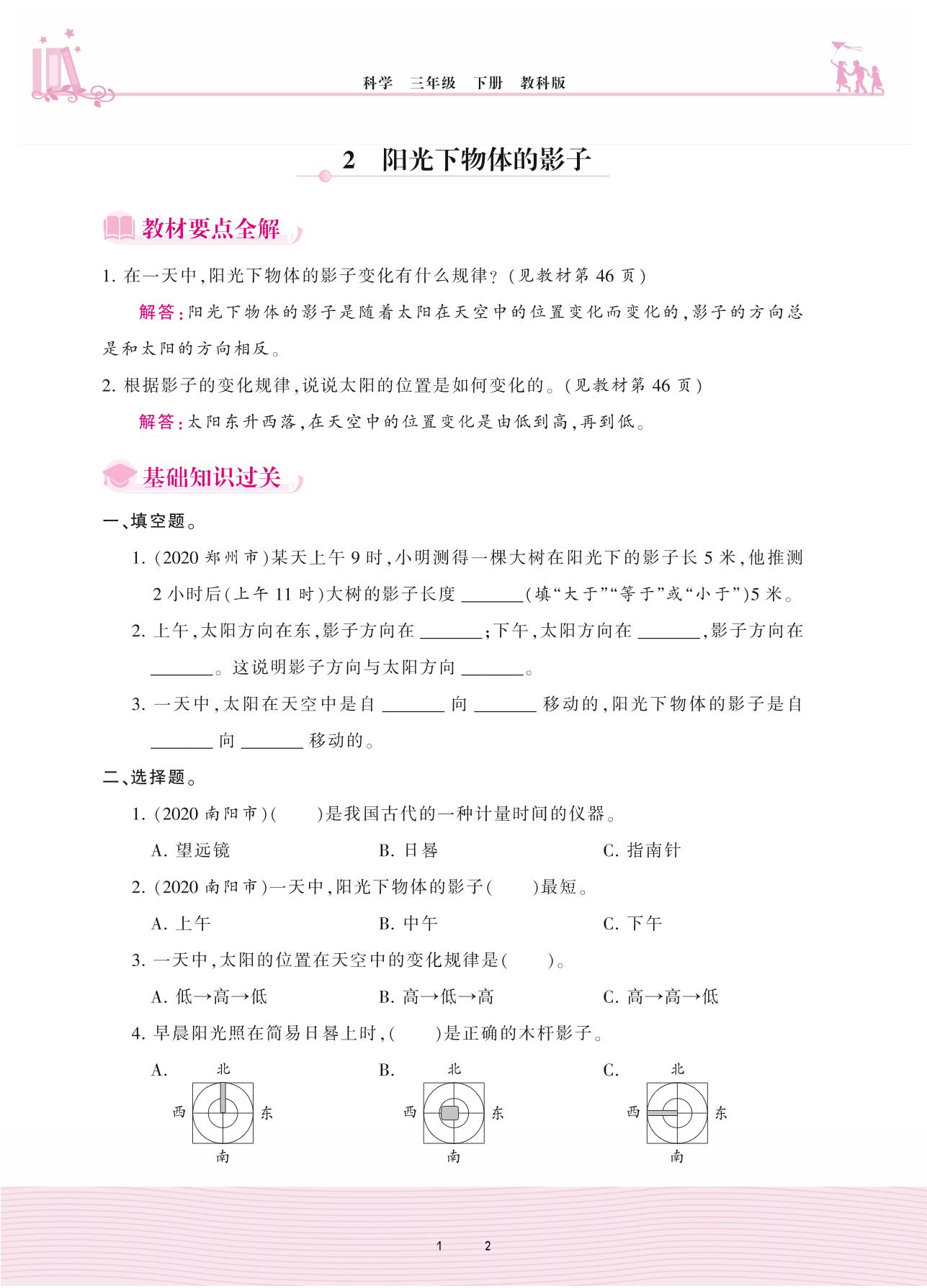 2021下册三年级科学教科版 第三单元 太阳、地球和月球——2 阳光下物体的影子