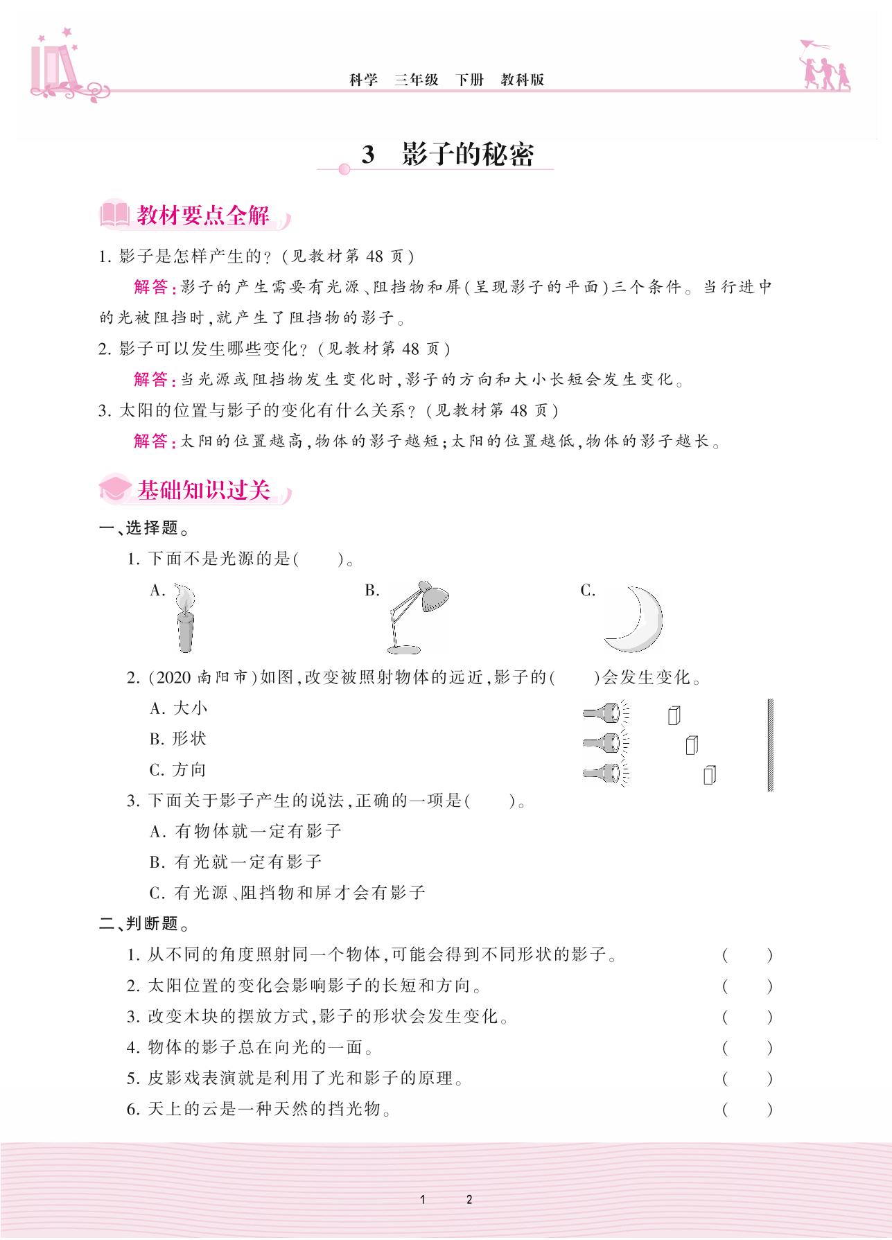 2021下册三年级科学教科版 第三单元 太阳、地球和月球——3 影子的秘密