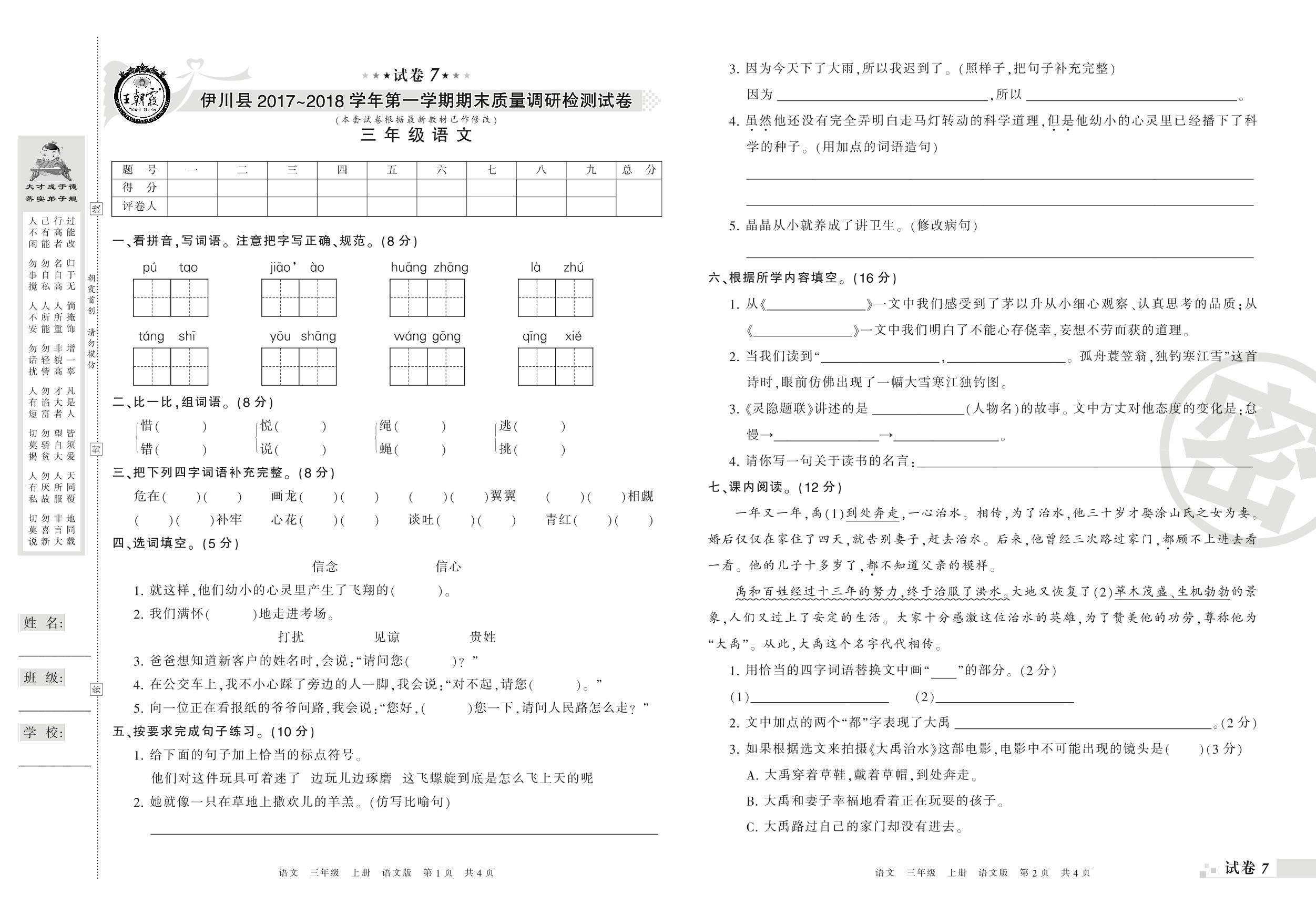 2017-2018学年第一学期洛阳市伊川县三年级语文试卷(语文版)【7】