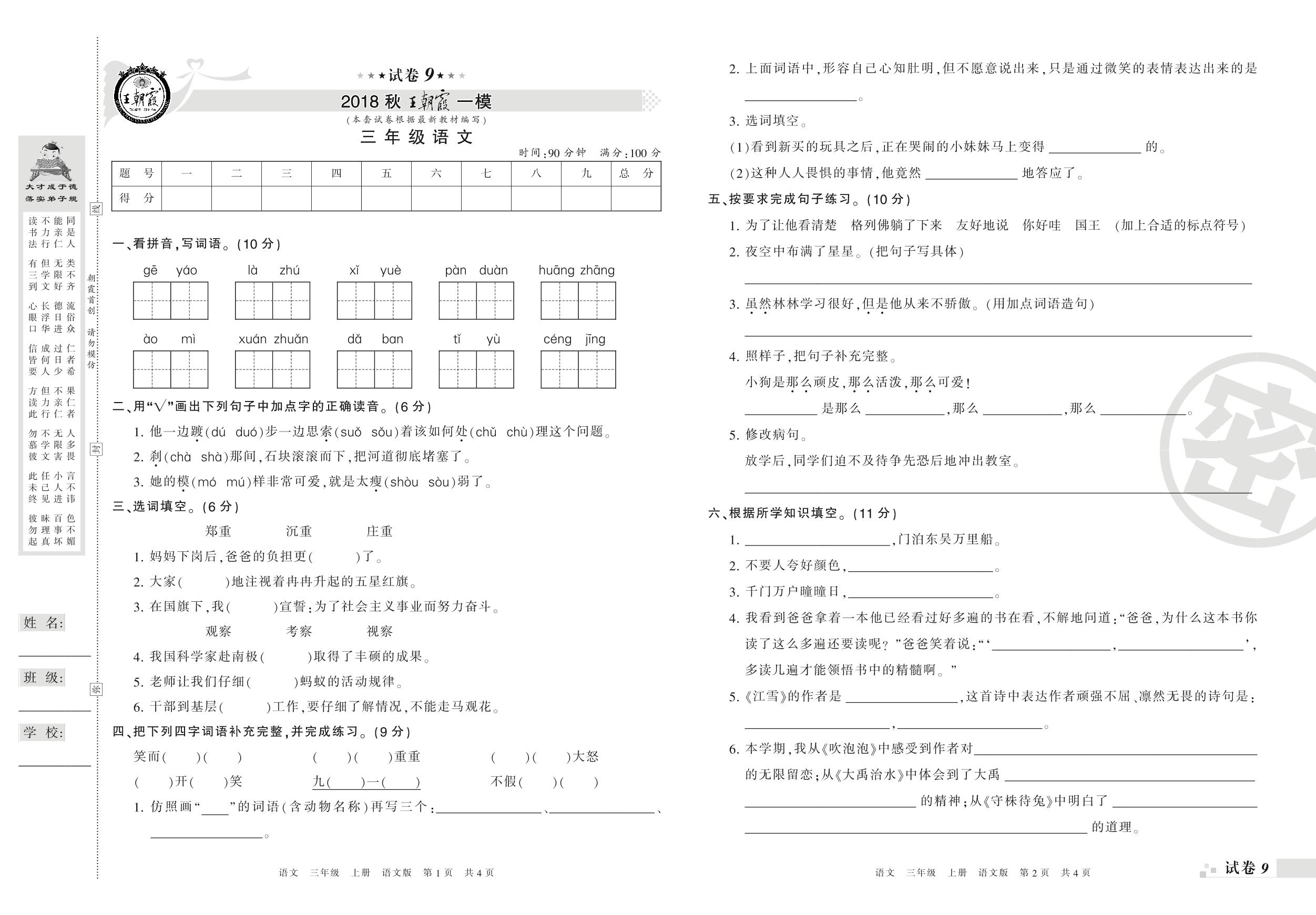 王朝霞期末模拟卷三年级上册语文(语文版)_R210801104024【9】