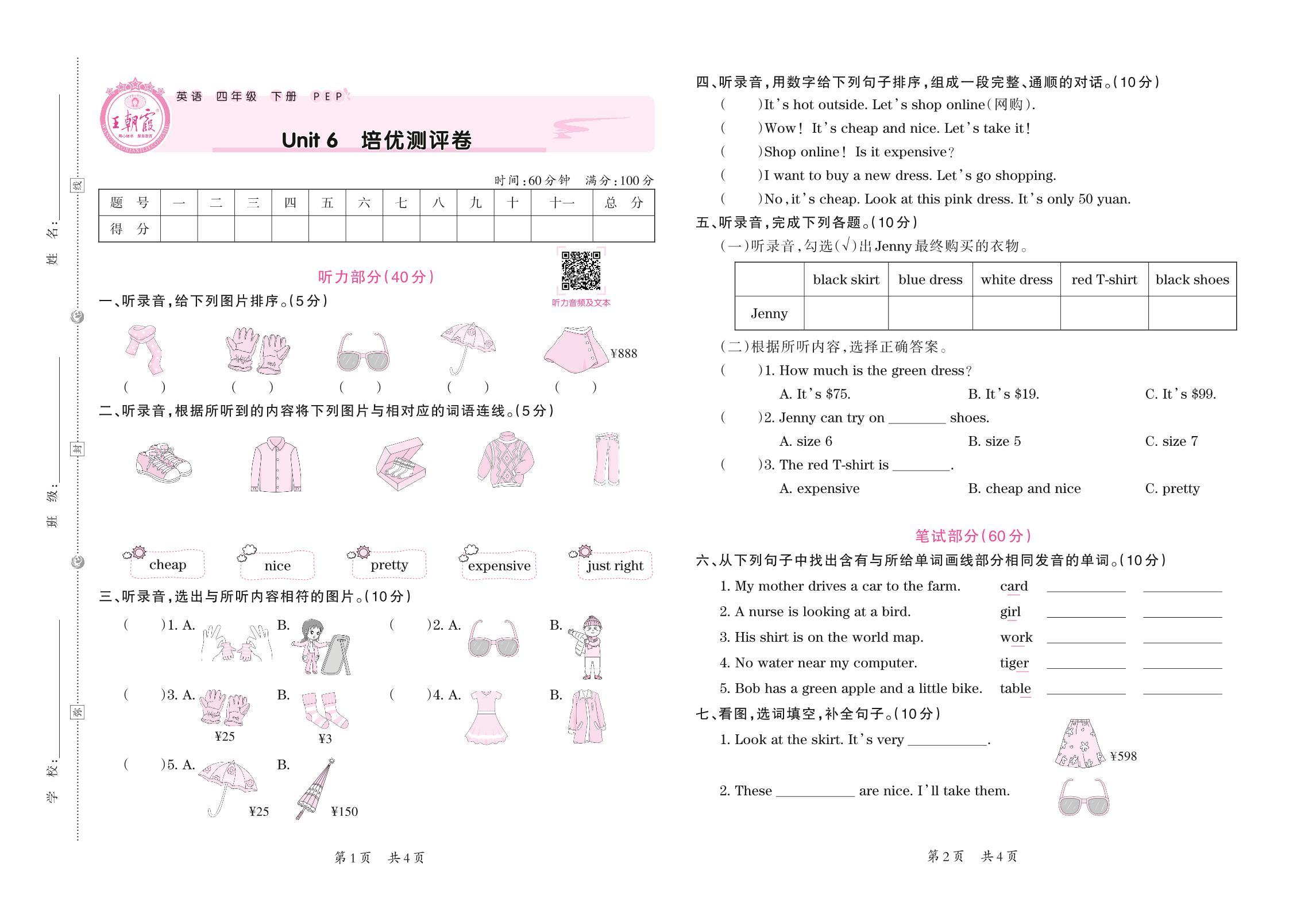 2021下册四年级英语PEP版 期中综合培优测评卷