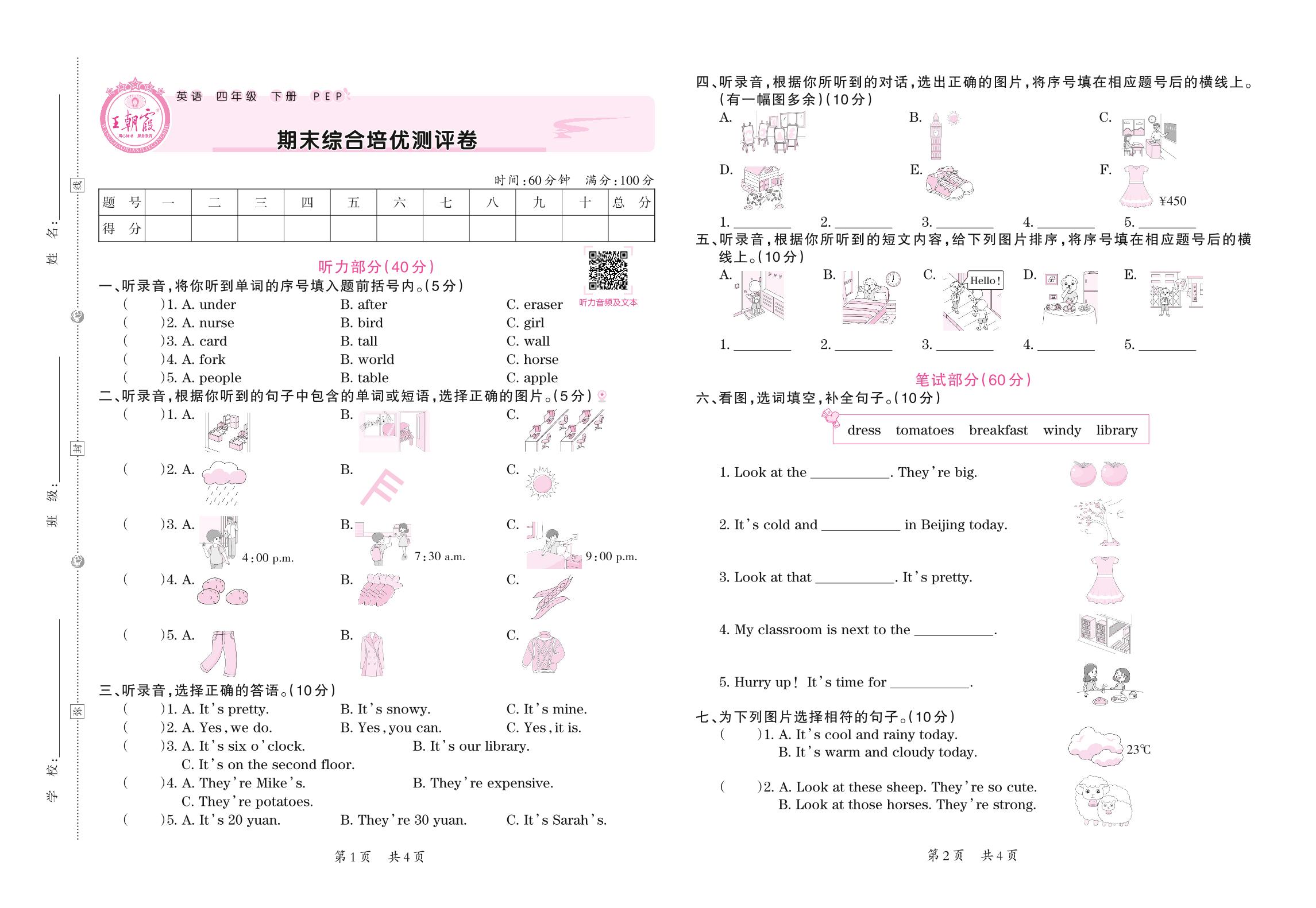 四年级英语人教PEP版(三起始)下册期末卷