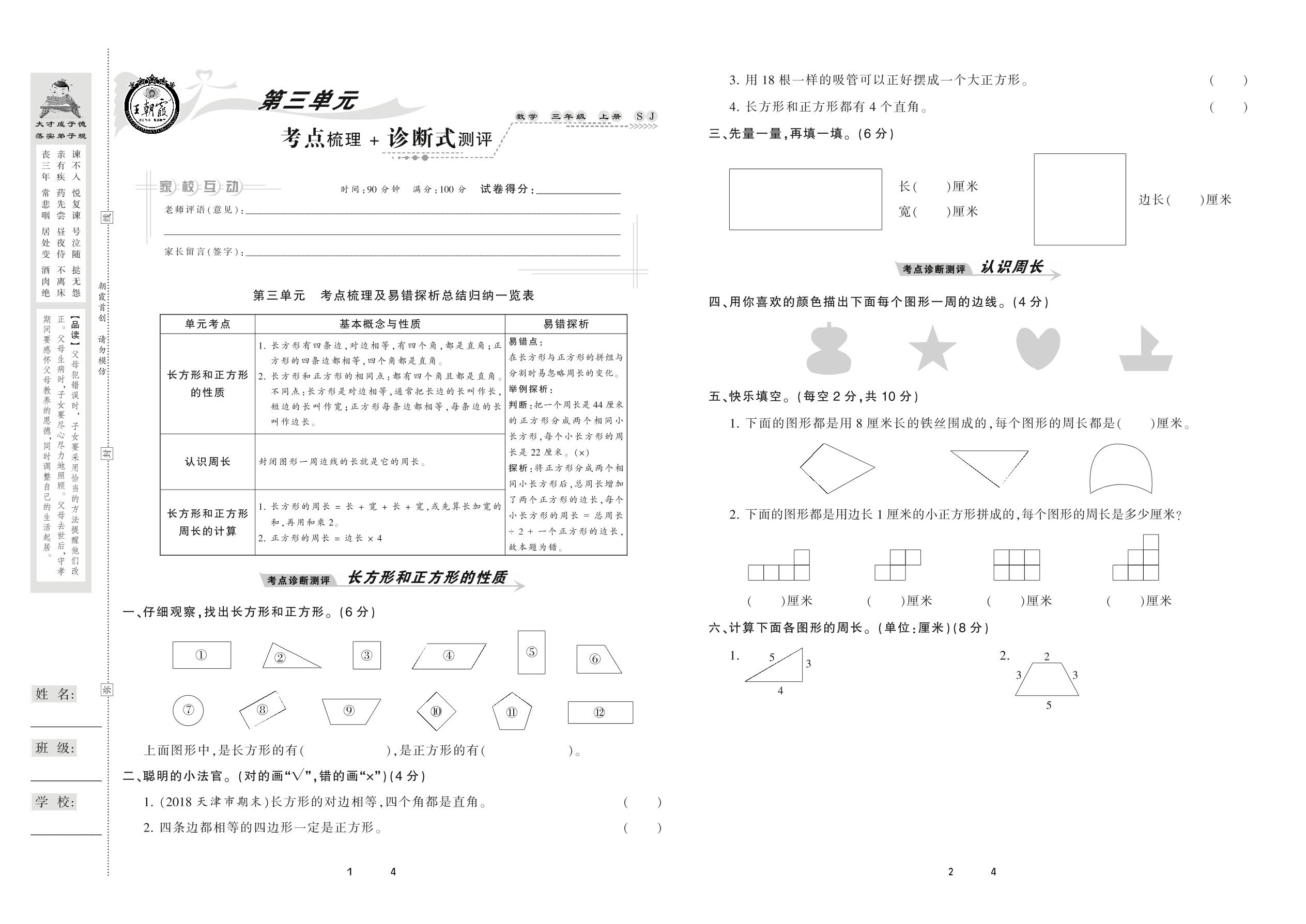 2020上册三年级数学苏教版 第三单元 考点梳理+诊断式测评