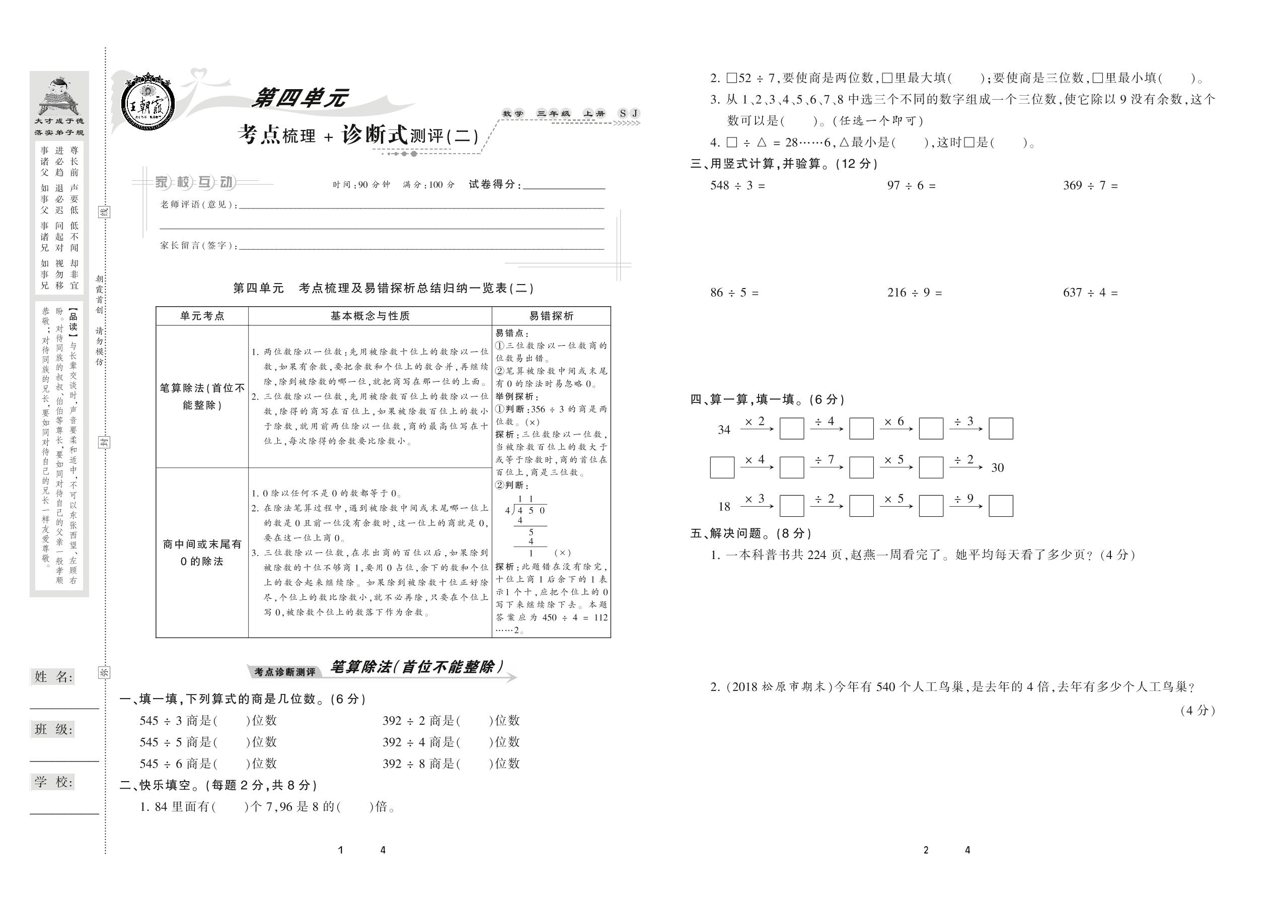 2020上册三年级数学苏教版 第四单元 考点梳理+诊断式测评(二)