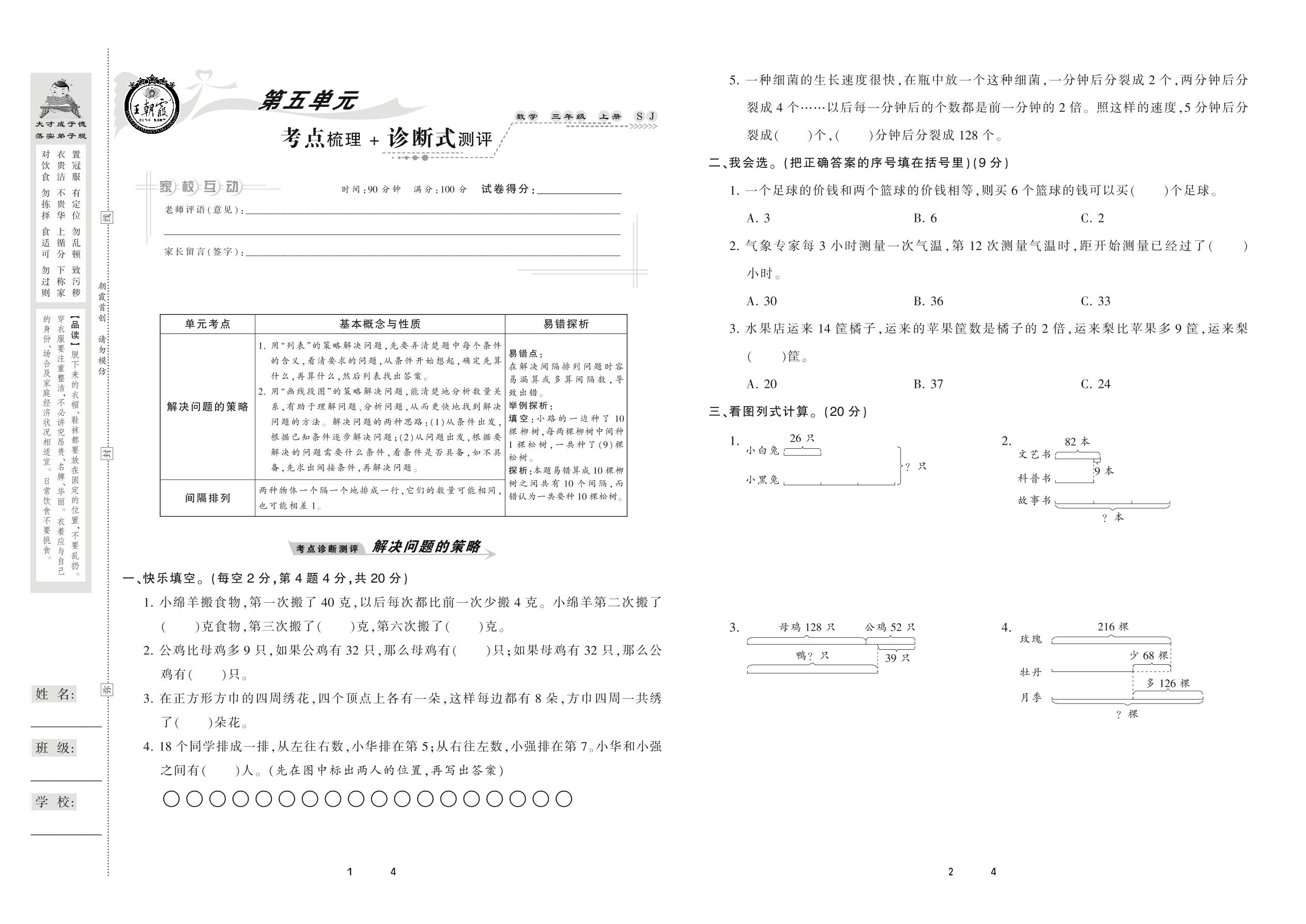 2020上册三年级数学苏教版 第五单元 考点梳理+诊断式测评