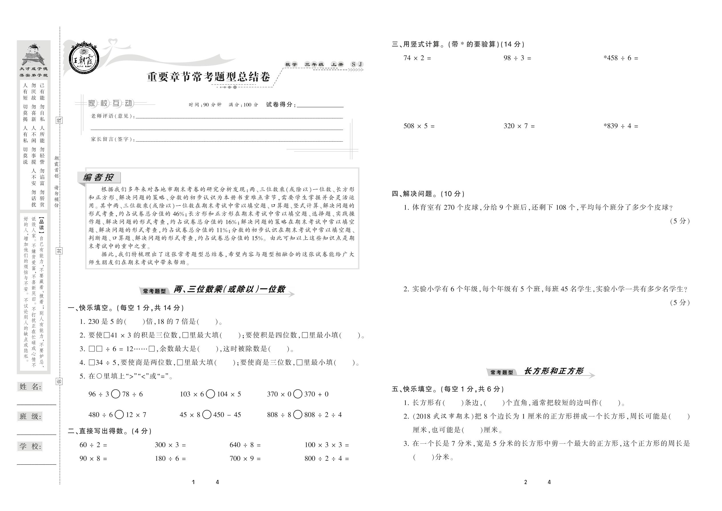 2020上册三年级数学苏教版 重要章节常考题型总结卷