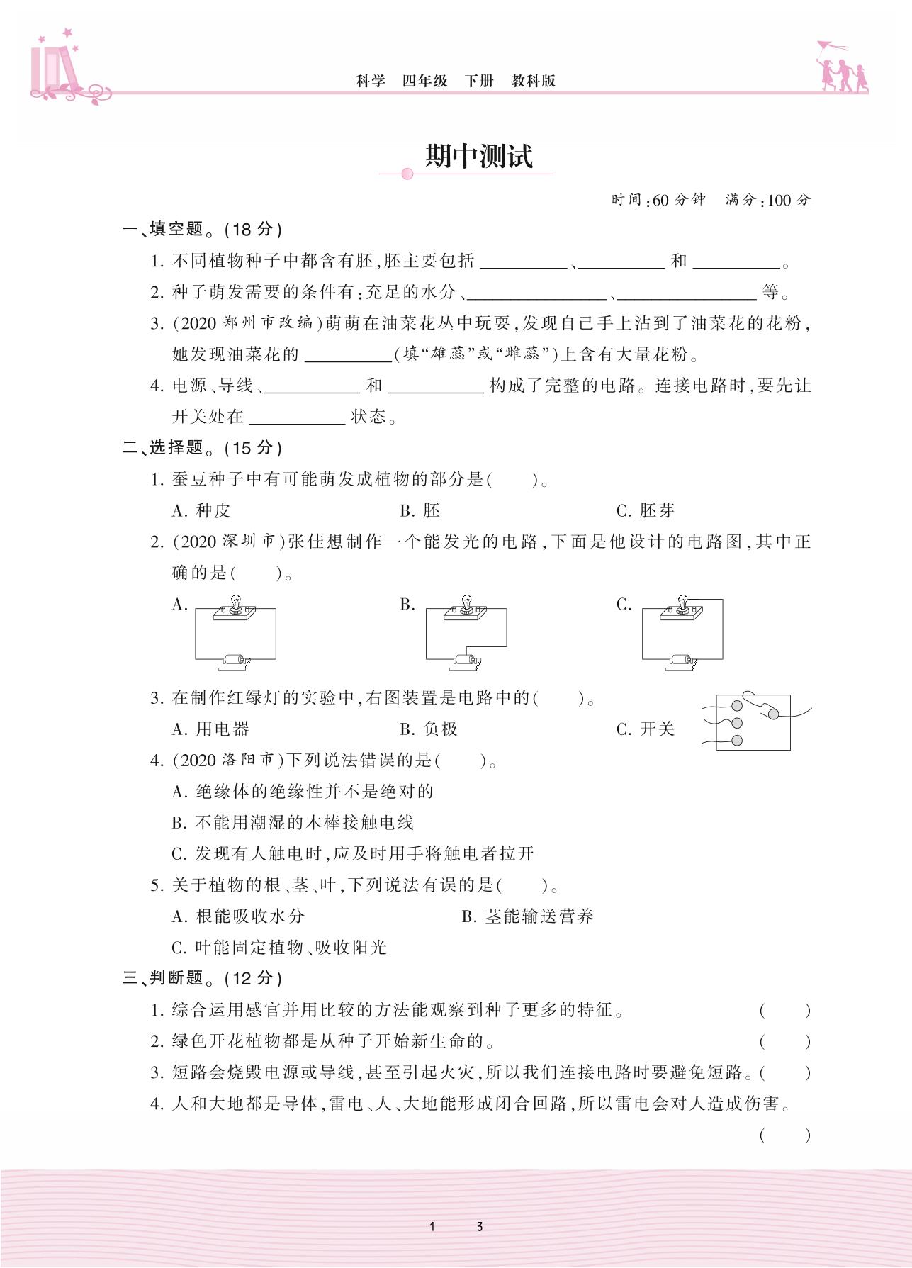 四年级科学教科版下册期中卷