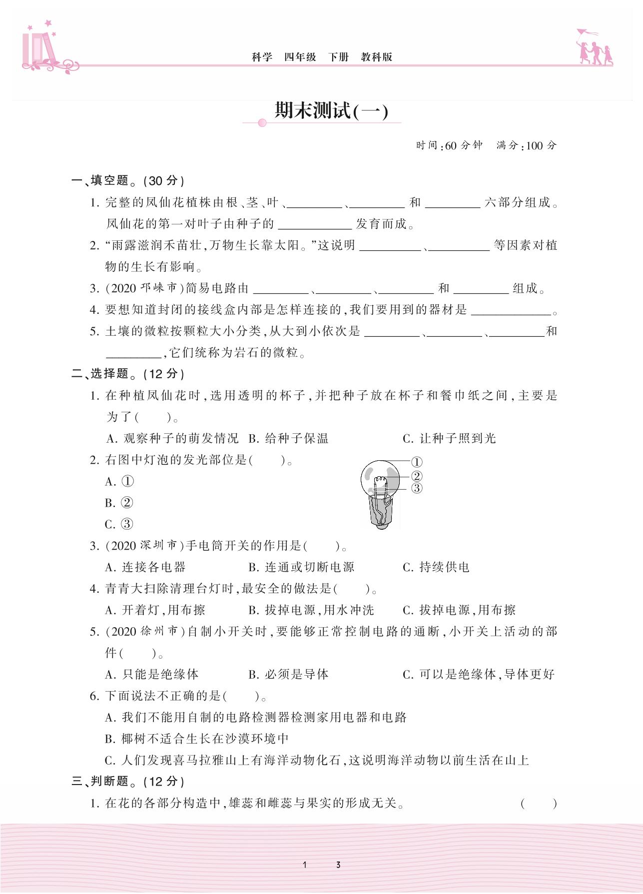 2021下册四年级科学教科版 期末测试(一)