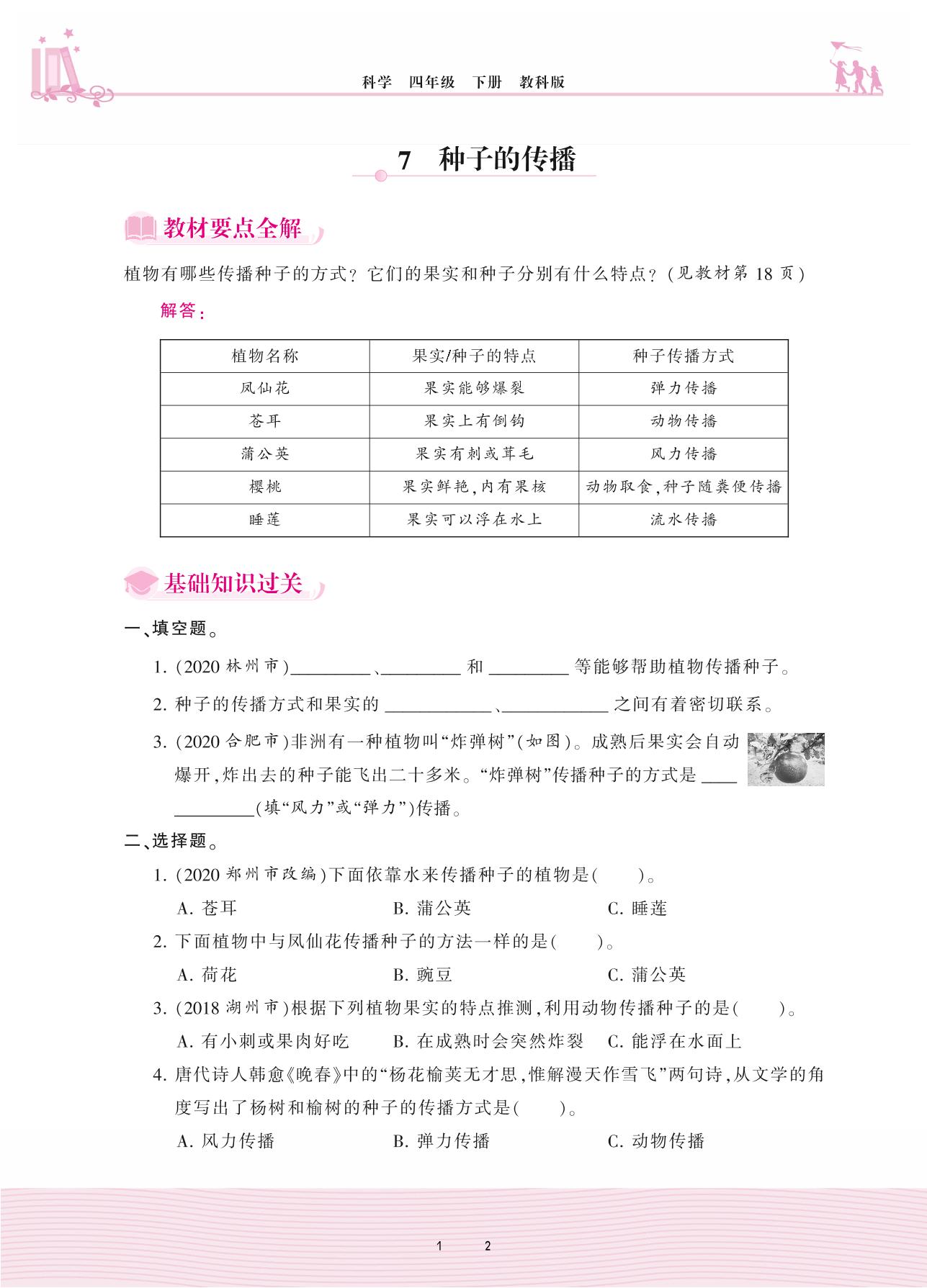 2021下册四年级科学教科版 第一单元 植物的生长变化——7 种子的传播