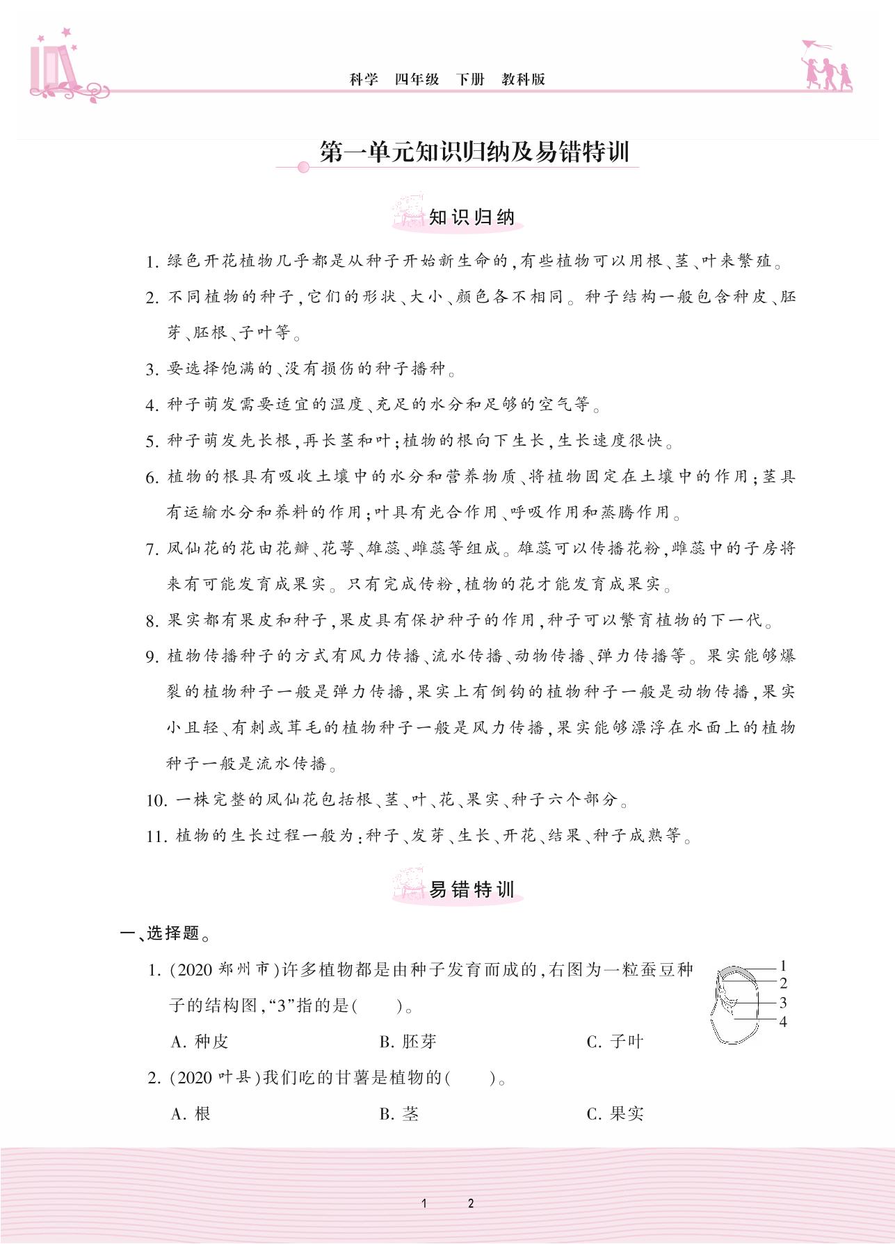 2021下册四年级科学教科版 第一单元 植物的生长变化——第一单元知识归纳及易错特训