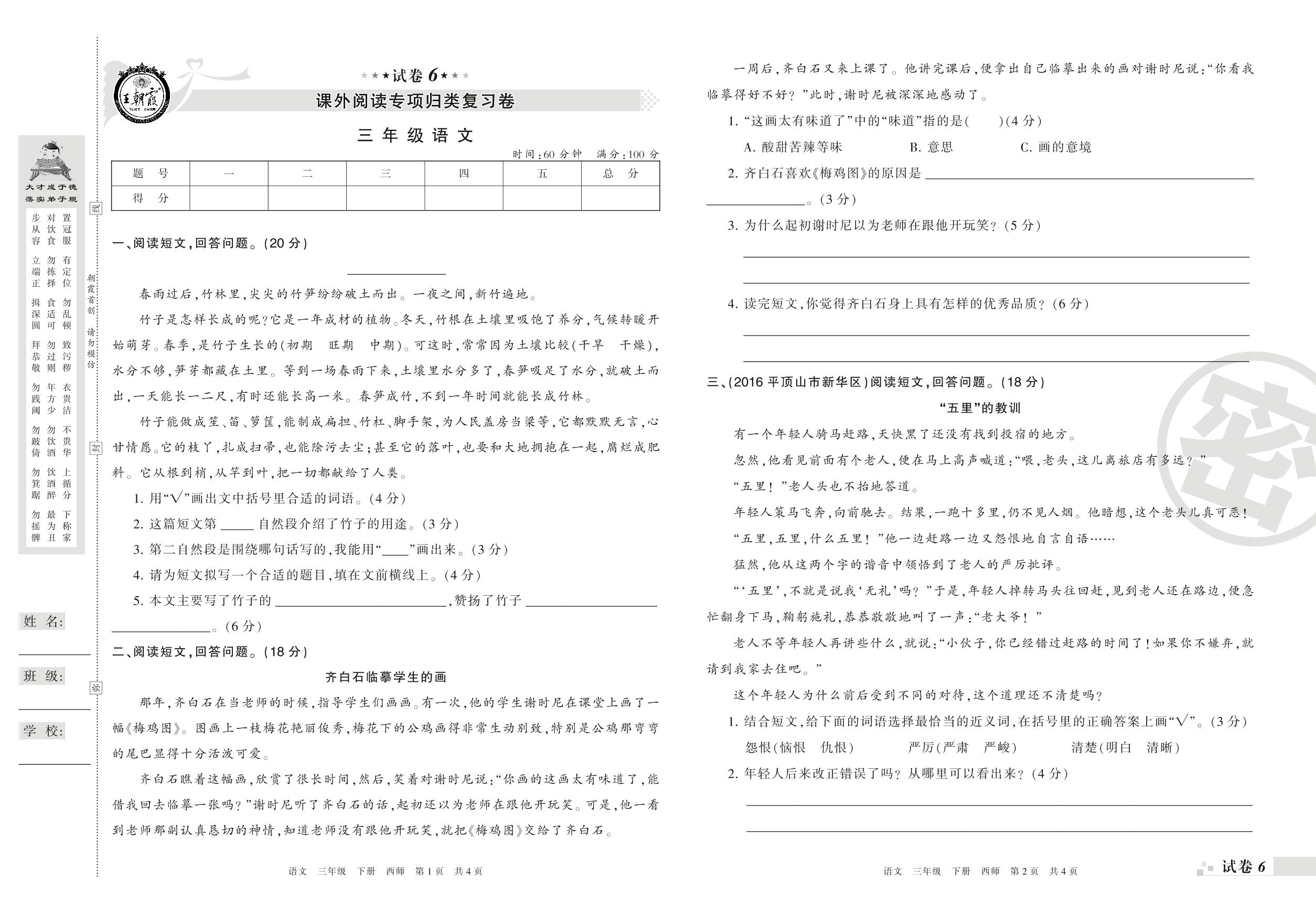 王朝霞期末专项卷——课外阅读专项归类复习卷三年级下册语文(西师版)_R210801104109【6】