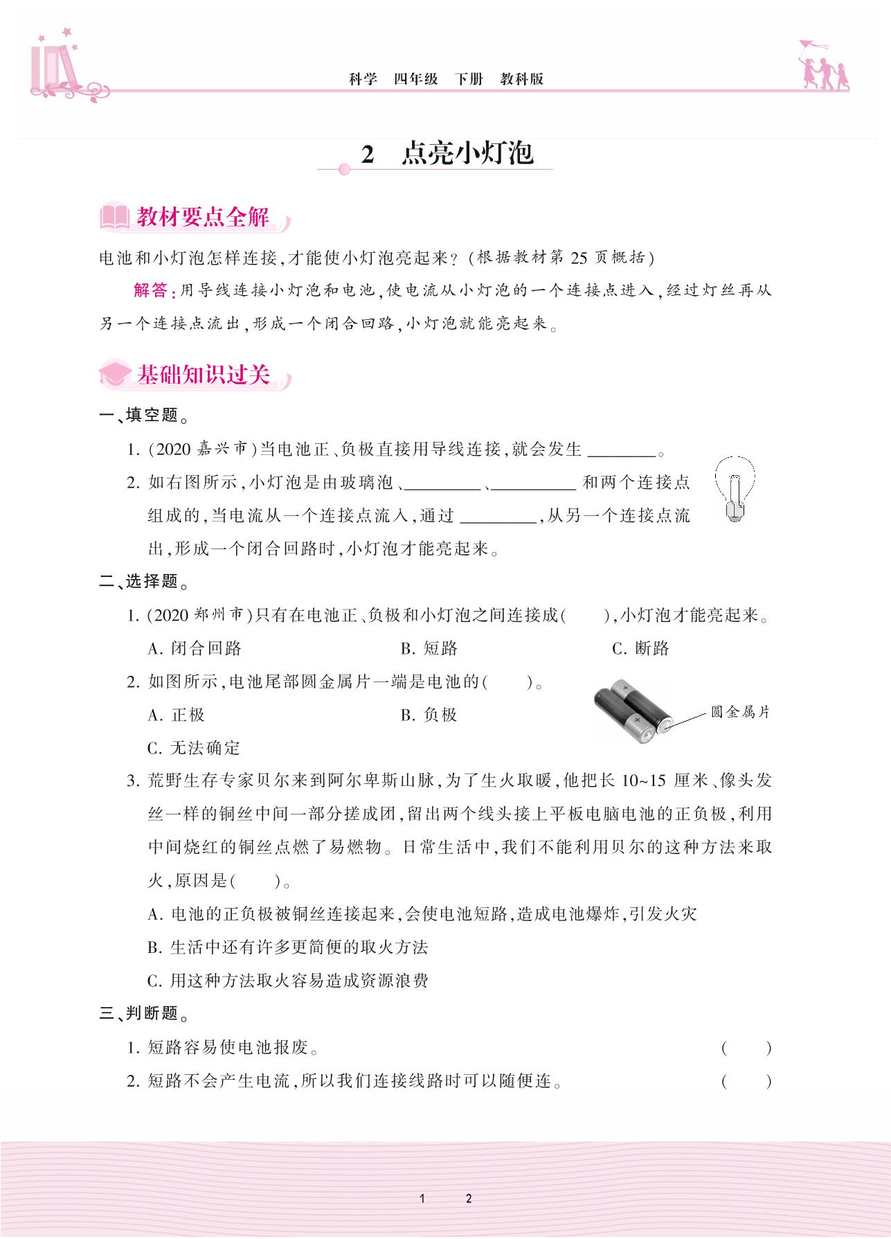2021下册四年级科学教科版 第二单元 电路——2 点亮小灯泡