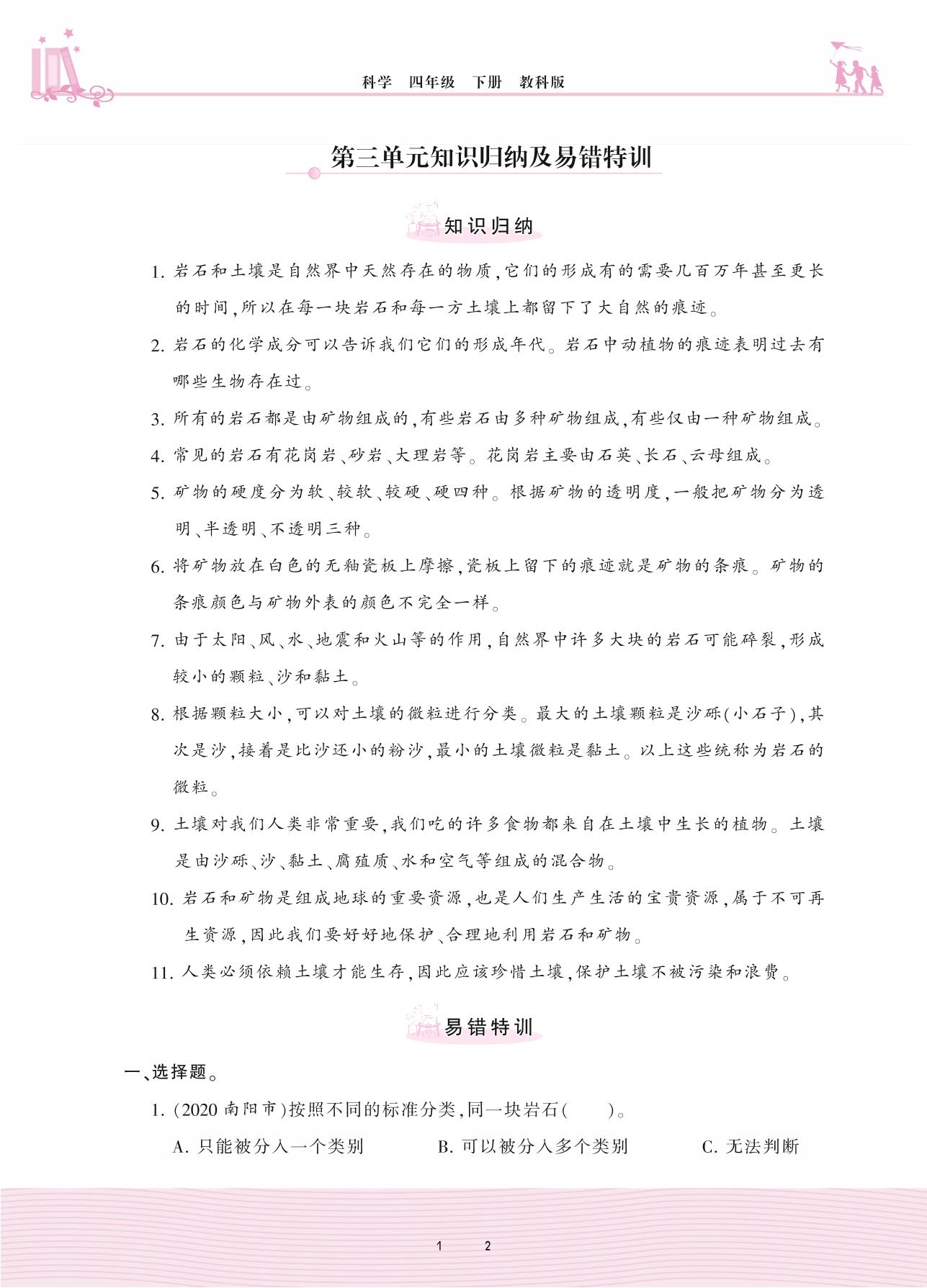 2021下册四年级科学教科版 第三单元 岩石与土壤——第三单元知识归纳及易错特训