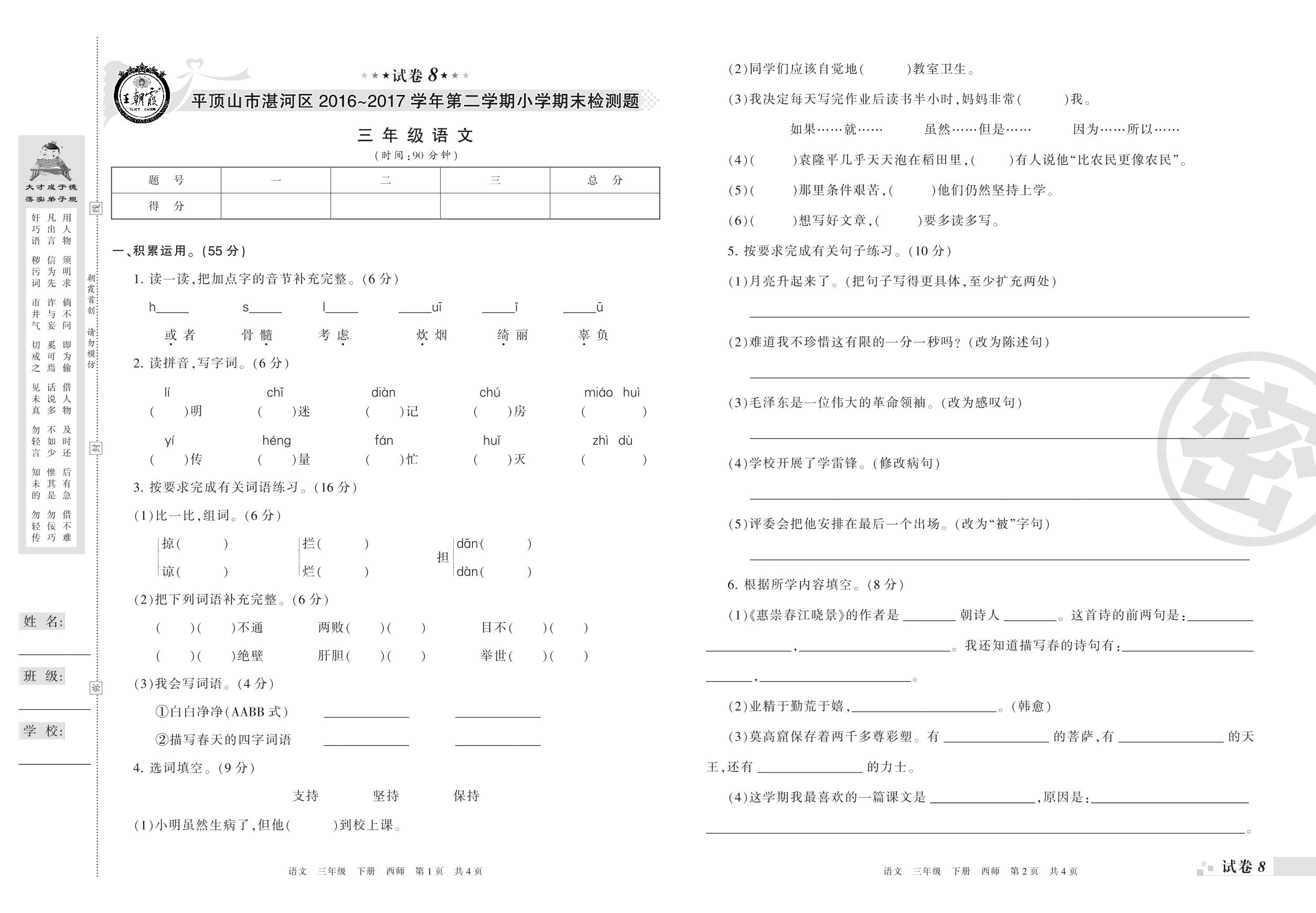 2016-2017学年第二学期平顶山市湛河区三年级语文试卷(西师版)【8】