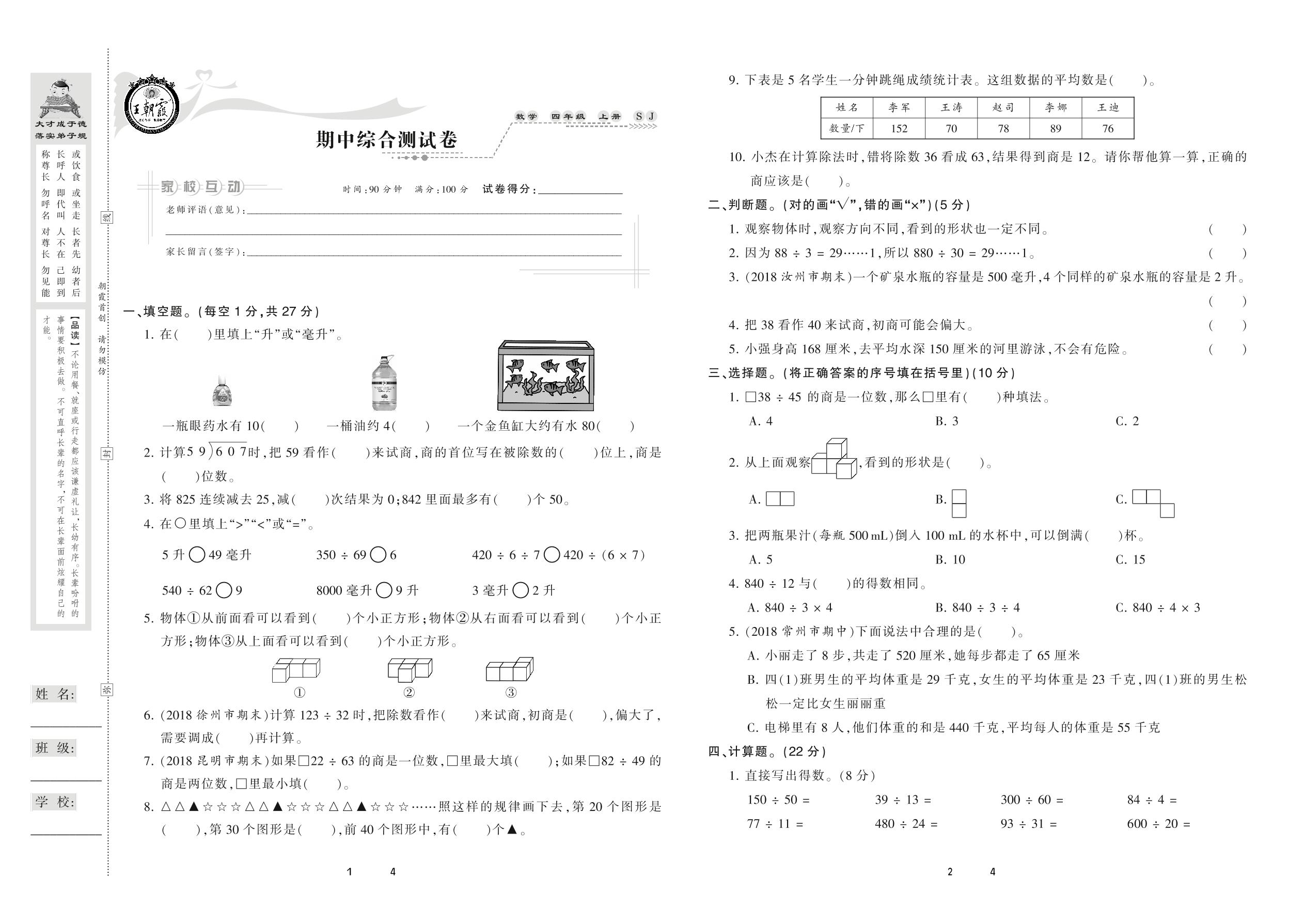2020上册三年级数学苏教版 期中综合测试卷_R210922173105713