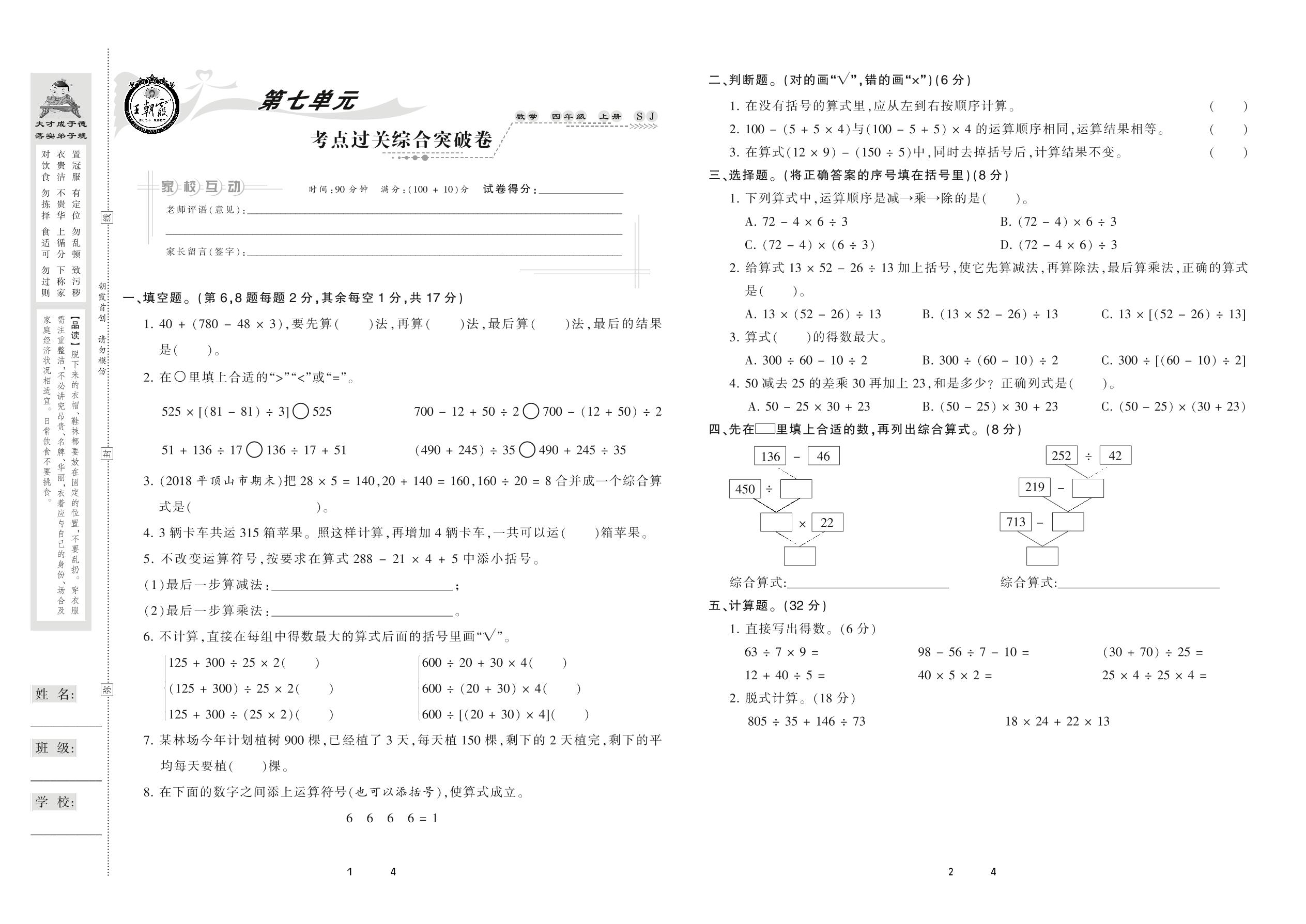 2020上册三年级数学苏教版 第七单元 考点过关综合突破卷_R210922173105115