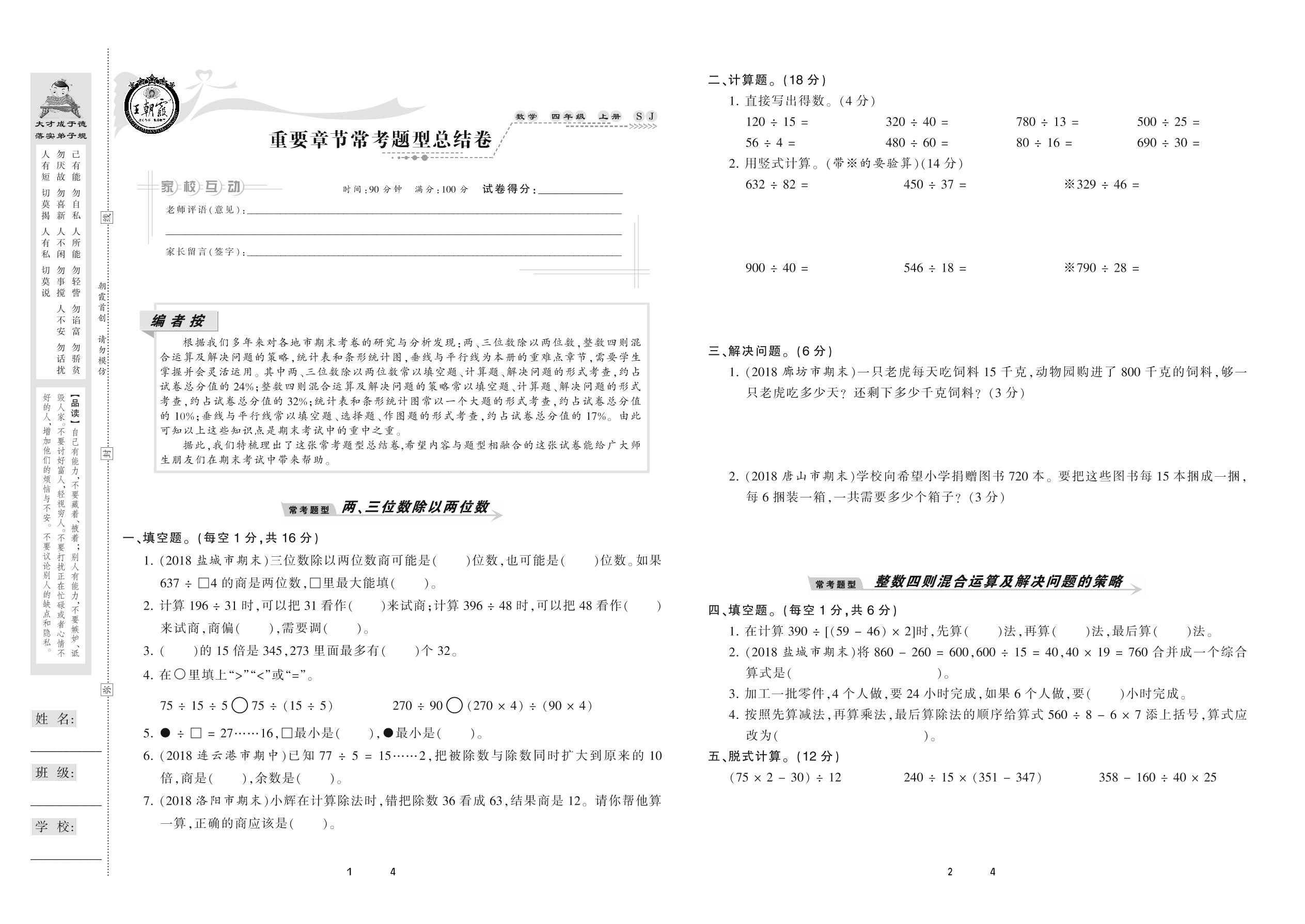 2020上册三年级数学苏教版 重要章节常考题型总结卷_R210922173106255