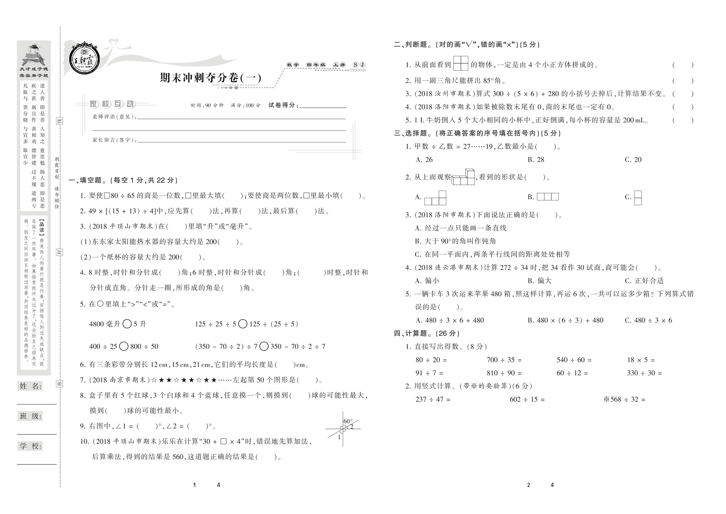 2020上册三年级数学苏教版 期末冲刺夺分卷(一)_R210922173106070